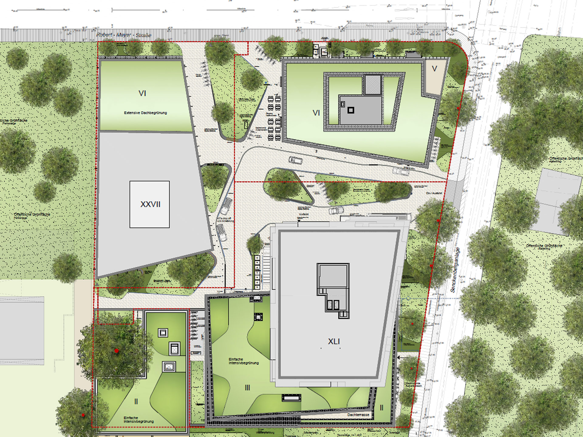 Die mit einer Tiefgarage unterbaute Fläche wird in den Grünzonen als intensive Dachbegrünung hergestellt. Die Laubbäume erhalten einen vergrößerten Wurzelraum durch zusätzliche Überhöhungen des Substrates. Ein Rasenteppich unter den Bäumen erzeugt offene, großzügige Raumbeziehungen. Die Begrünung der Dachflächen auf den Gebäuden trägt zur Steigerung der gestalterischen und ökologischen Qualität des Ensembles bei.