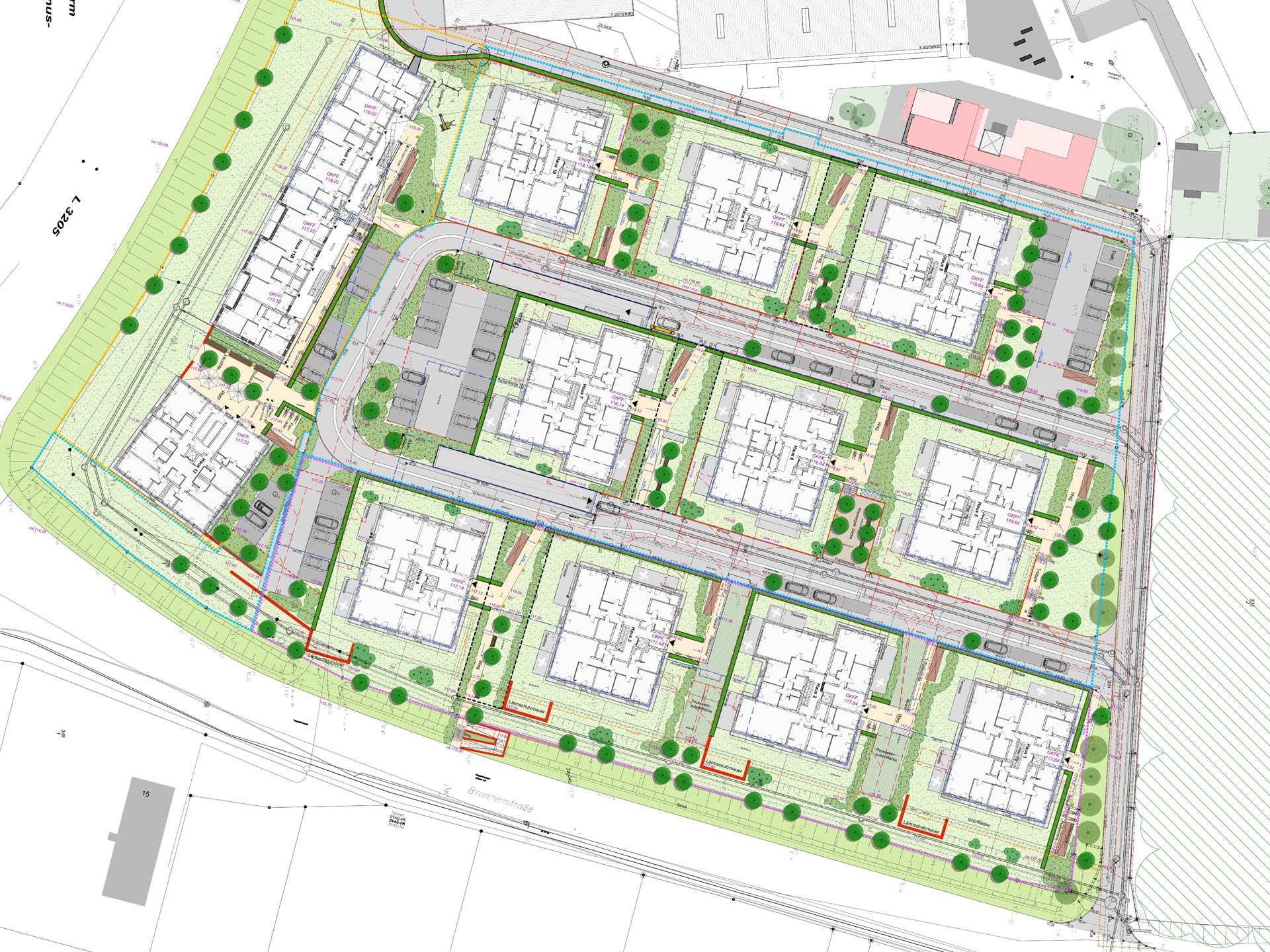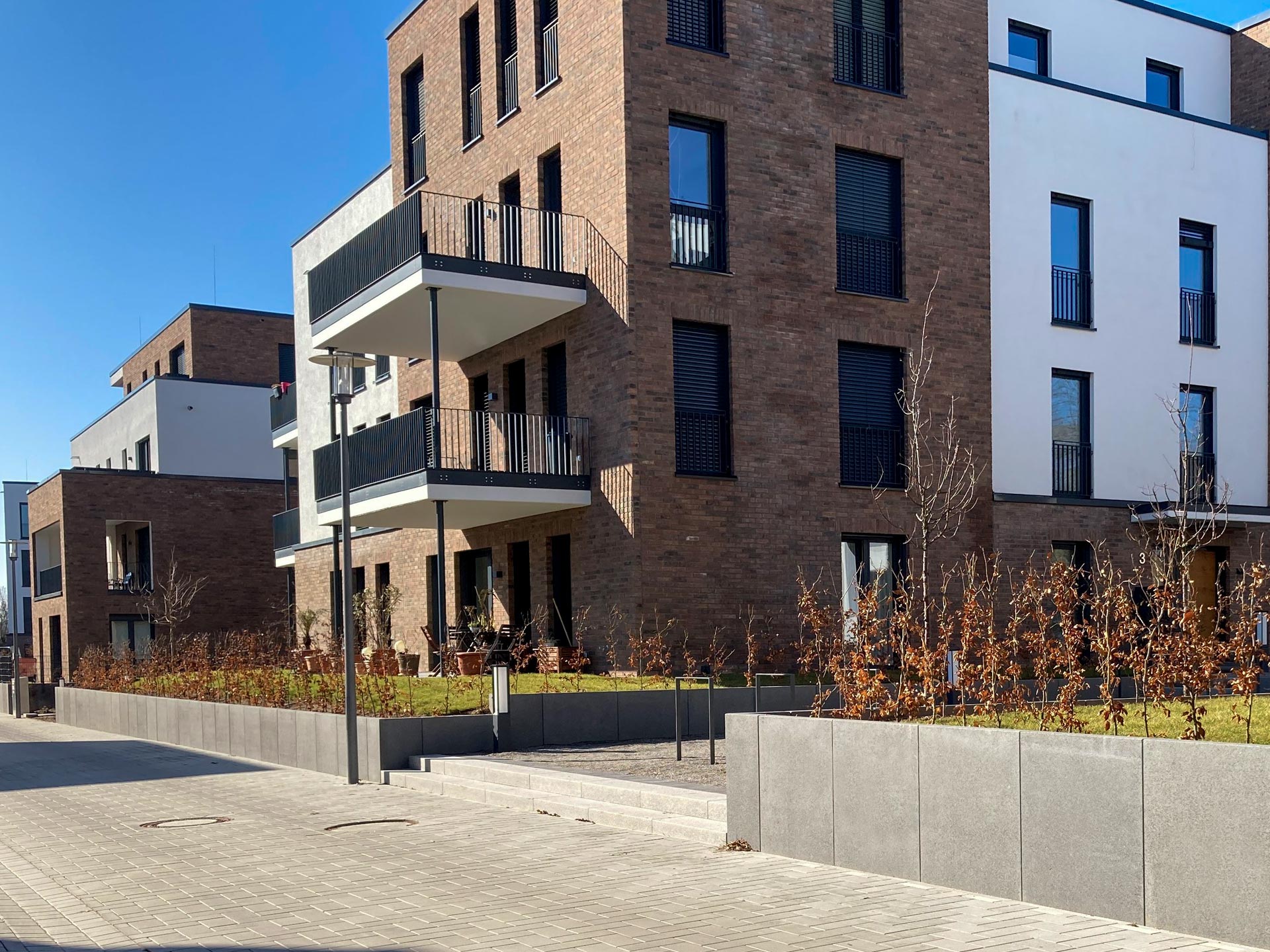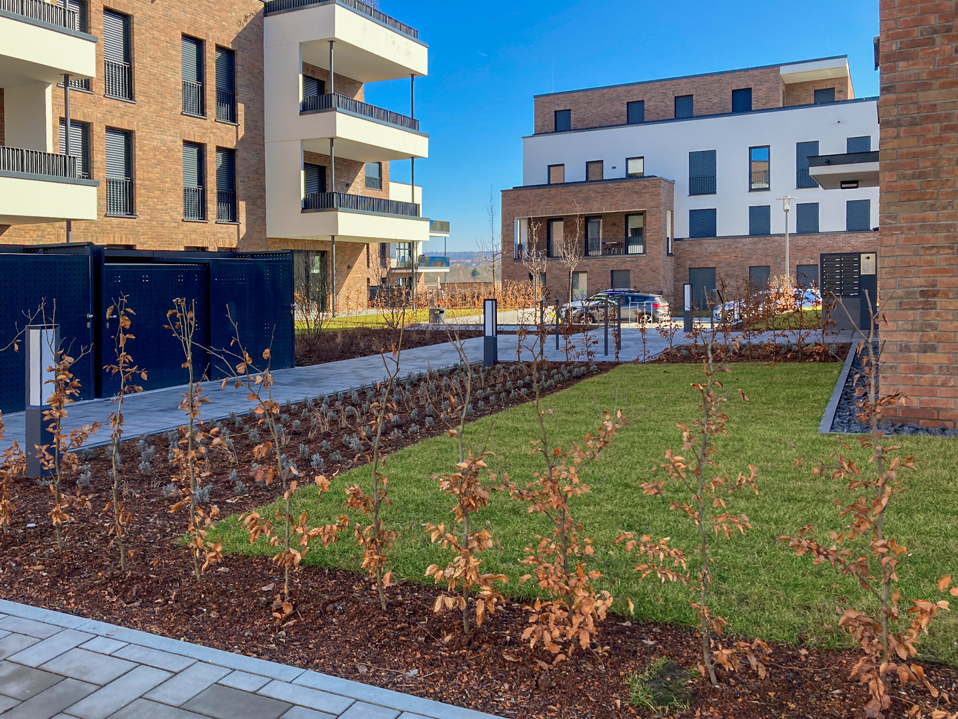 Die öffentlichen und halböffentlichen Grünräume werden mit formal angeordneten Baumpflanzungen hervorgehoben. Zusammen mit den weiteren Grün-Elementen wie Hecken und Stauden-/Gräser-Mischpflanzungen erhält das Gebiet so seinen typischen Charakter.