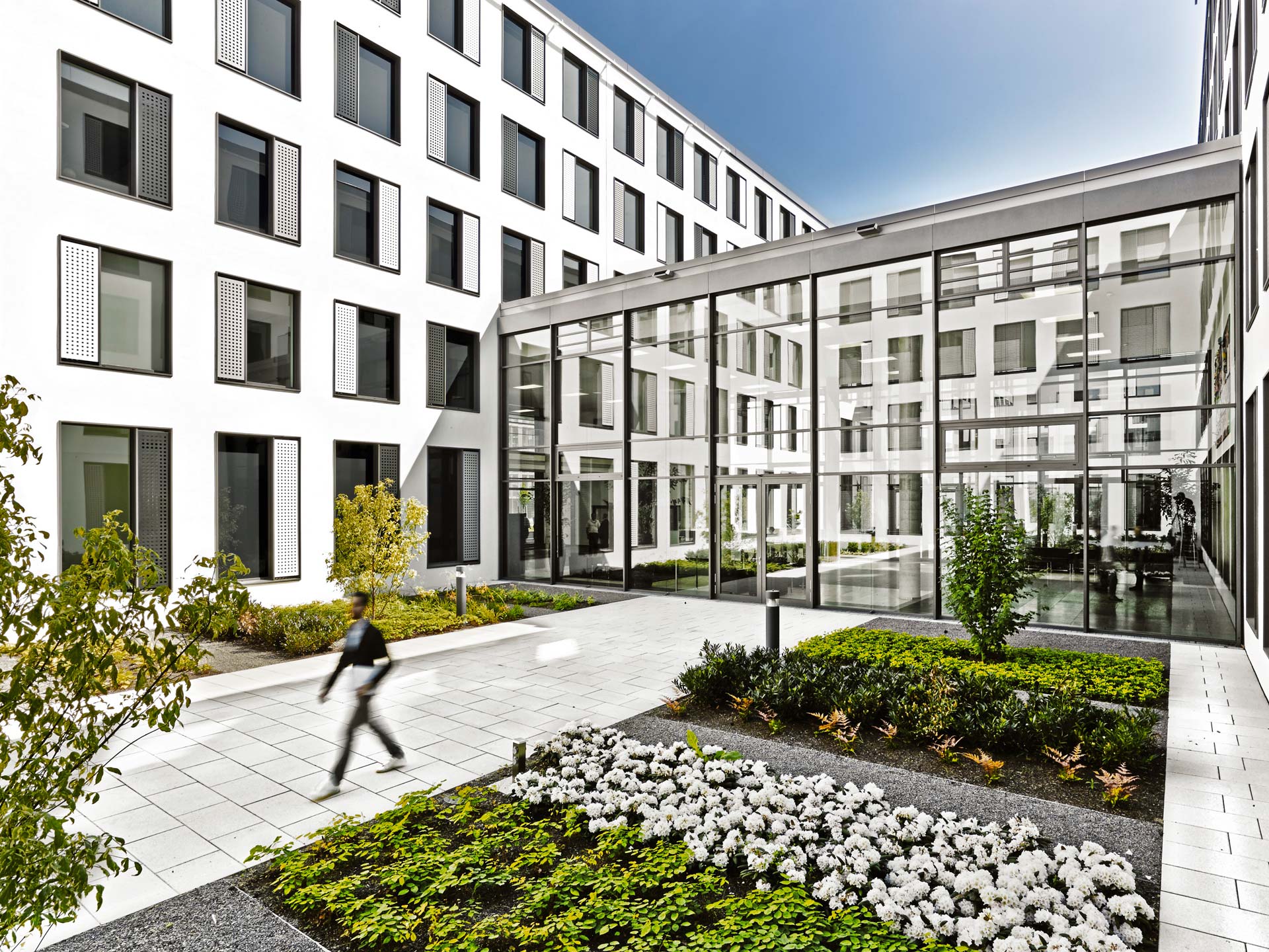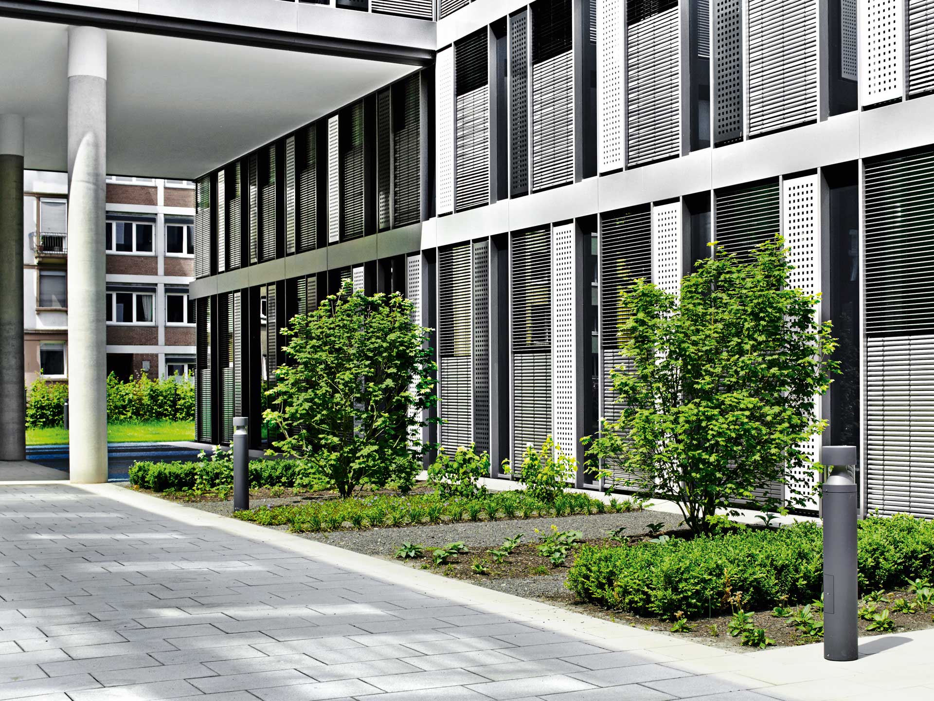 Das Gebäude wird mit seinen Vorzonen im Rahmen der Außenanlagenplanung gestalterisch und funktional in das bestehende städtische Umfeld eingebettet. Die sechs Innenhöfe erhalten eine Rahmenstruktur aus einem Plattenbelag, der an die Magistrale, die zentrale Erschließungsachse im Gebäude angebunden ist. Die beiden mittleren Höfe sind über den Plattenbelag mit der Kantine verbunden. Innerhalb dieses Rahmens entwickeln sich Vegetationsstrukturen aus Gräsern, Stauden und Gehölzen, die im Wechsel mit farbigem Kies oder Kalkschotter ein artifizielles Muster bilden.