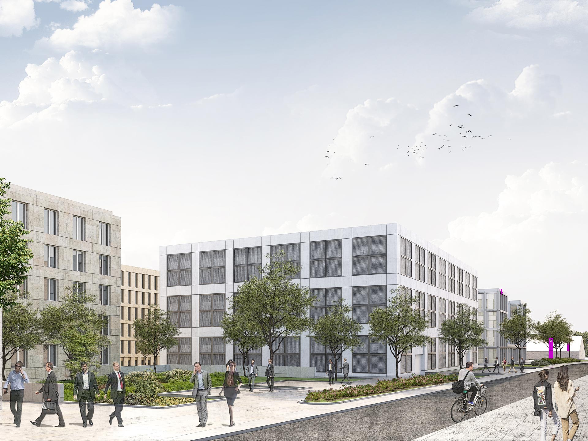 Die freiraumplanerischen Maßnahmen folgen im weitesten Sinne dem Leitgedanken eines durchgrünten Stadtquartiers. Aus diesem Thema entwickelt sich eine großzügige Grundstruktur mit zwei kleinen Stadtplätzen und zwei von Süd nach Nord angelegten Achsen durch das Quartier.