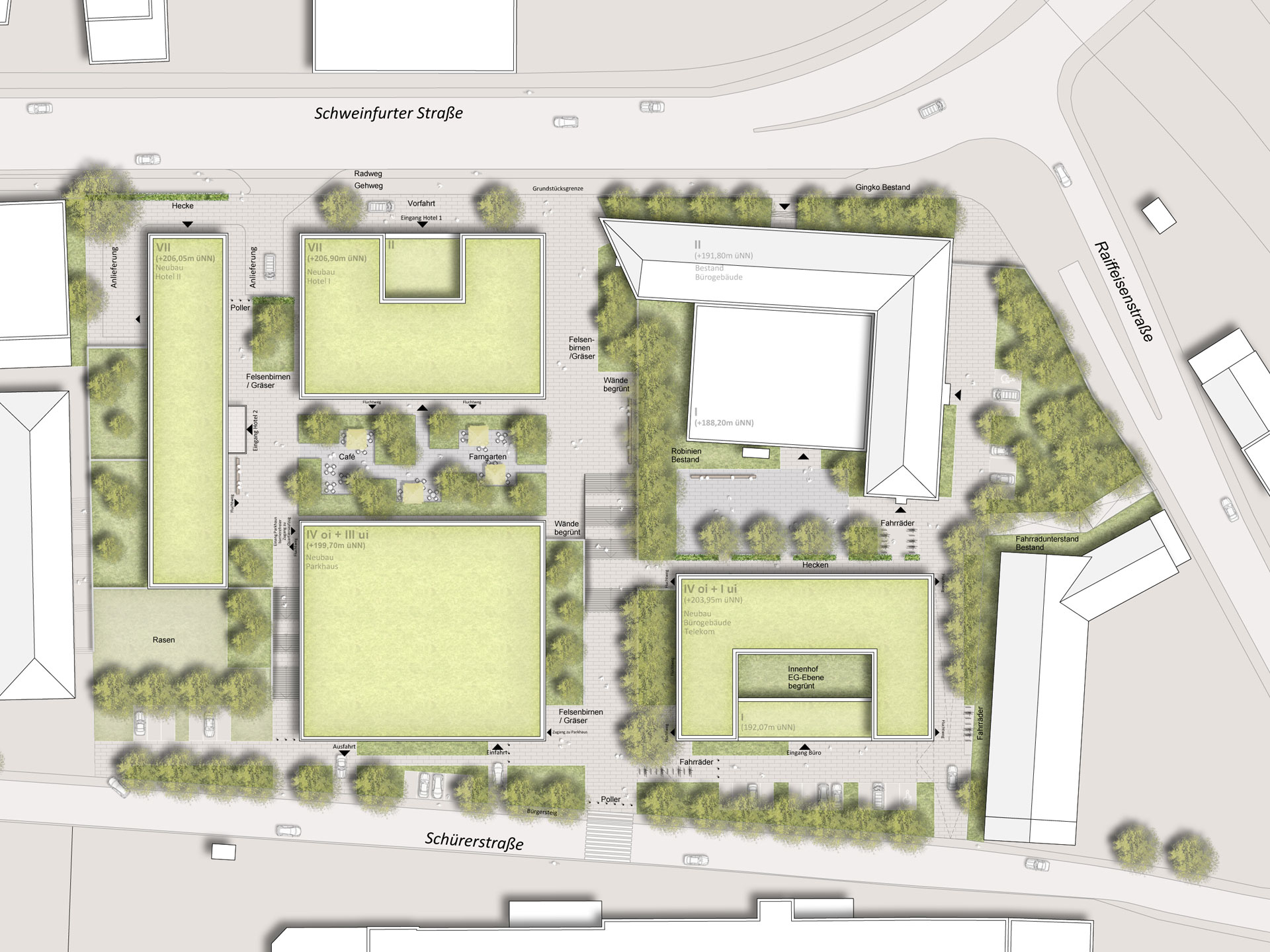 Die Erschließung der Haupteingangsbereiche für die beiden Hotels erfolgt über eine Vorfahrt mit einer getrennten Zu- und Ausfahrt von der Schweinfurter Straße. Alle Eingänge im Quartier werden barrierefrei erschlossen.
