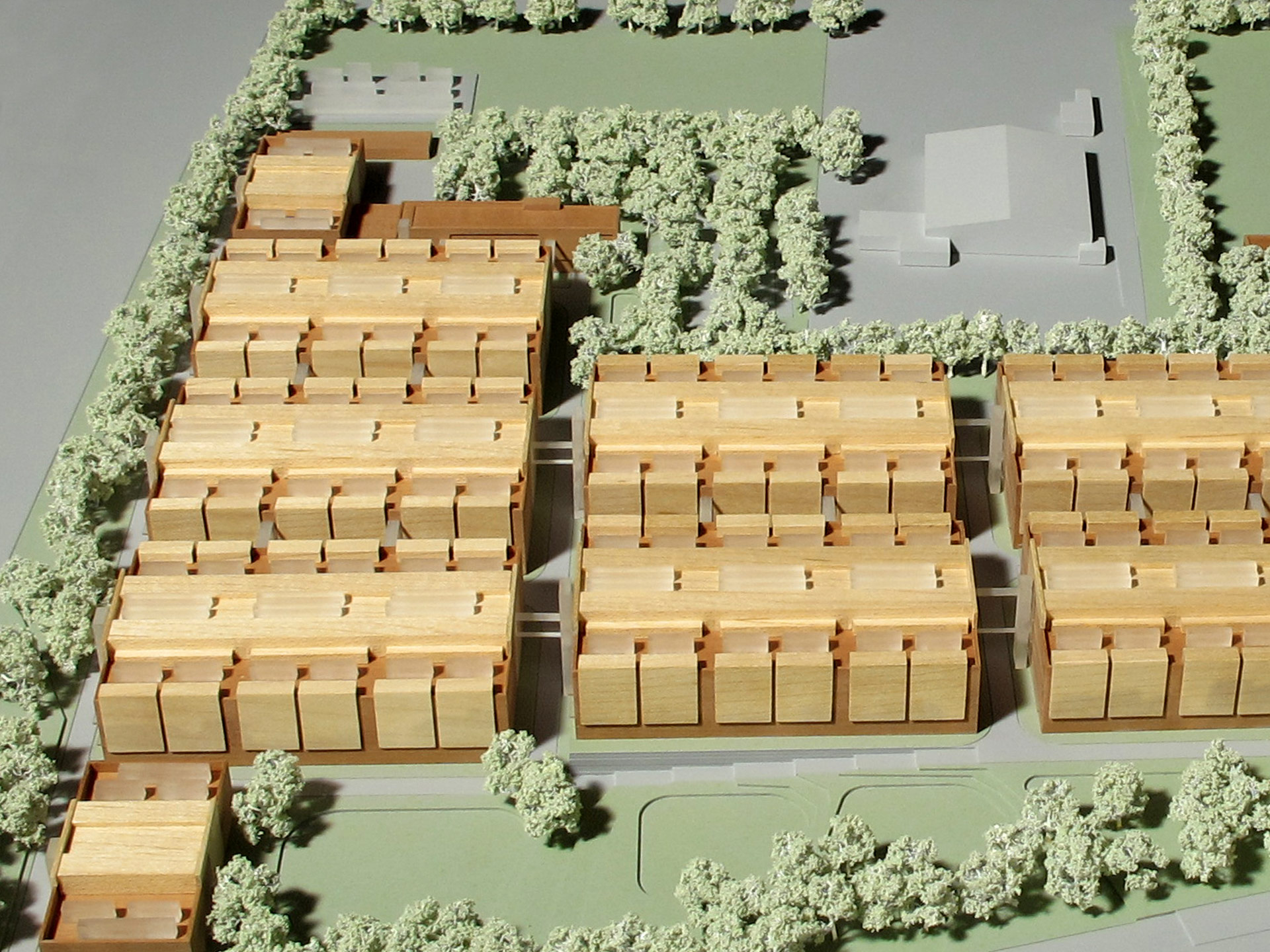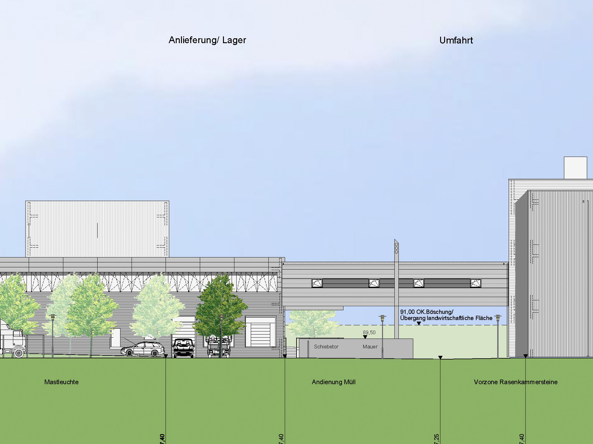 Die Topographie des vorhandenen Geländes zeigt ein in W-O-Richtung fallendes Gelände. Die Planung schafft im Bereich des 1. Bauabschnittes ein neues Höhenniveau als ebene Geländeplattform auf der sich alle Gebäude und Infrastruktureinrichtungen der Planung einordnen.