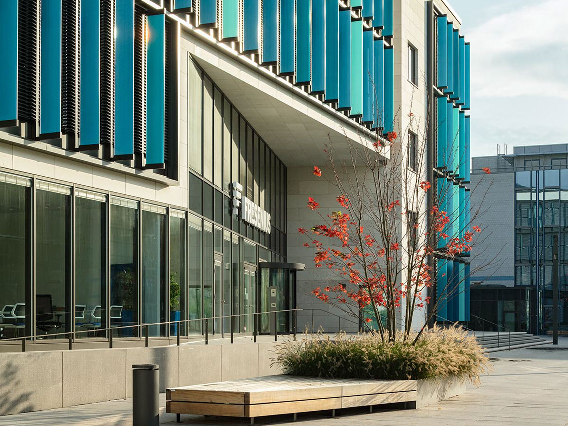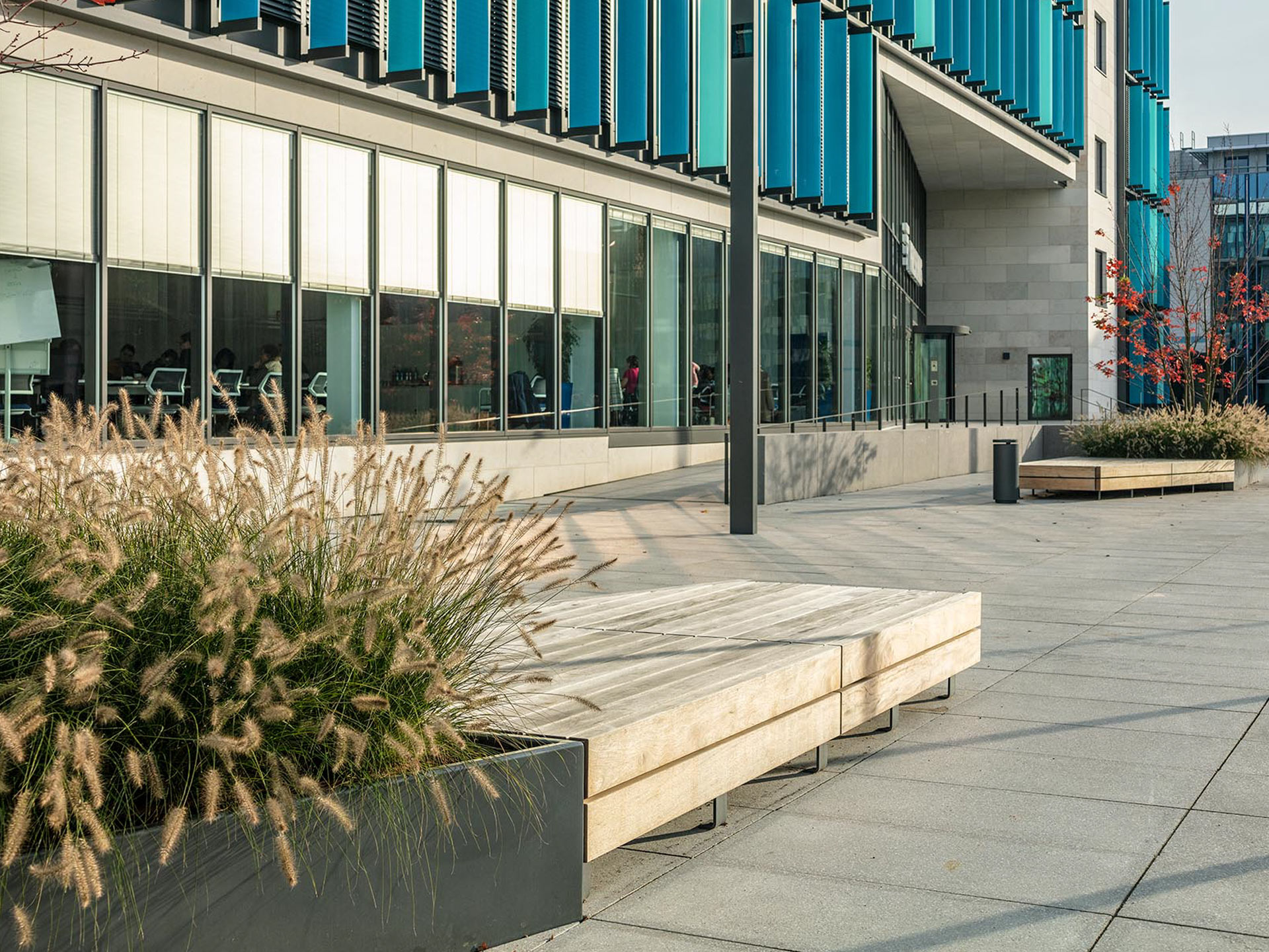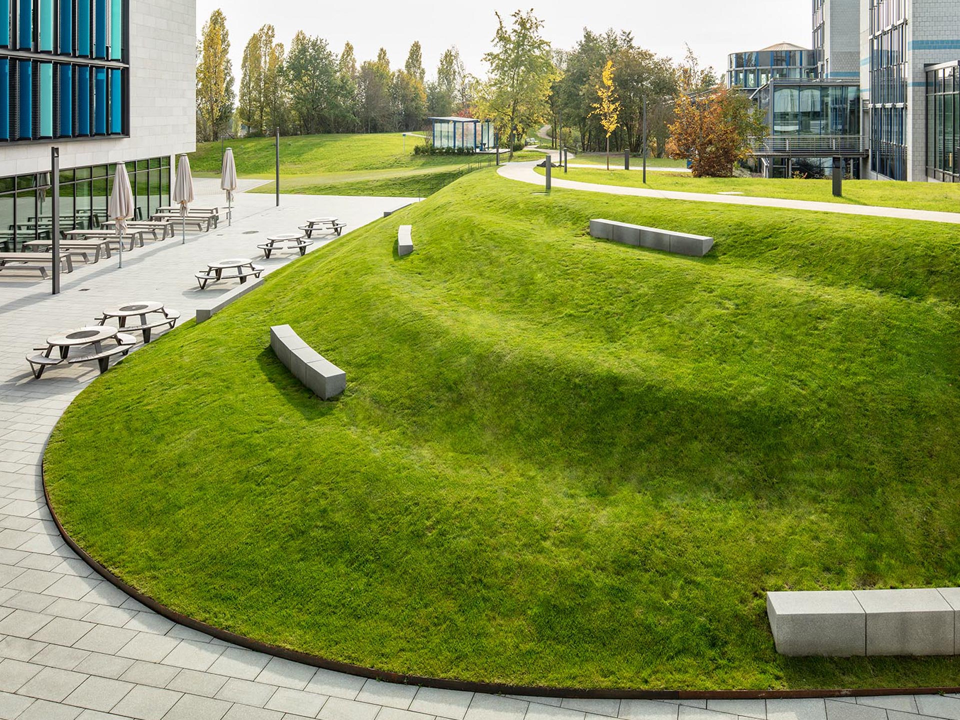 Durch seine klare geometrische Form hebt sich der neue Campus-Park, flankiert von der mit Großformatplatten befestigte Esplanade als Bindeglied für alle zukünftigen baulichen Erweiterungen, ab. Der Campus-Park dient gleichzeitig als adressbildender, repräsentativer Eingangsbereich und attraktiver Aufenthaltsbereich für alle Mitarbeiter.