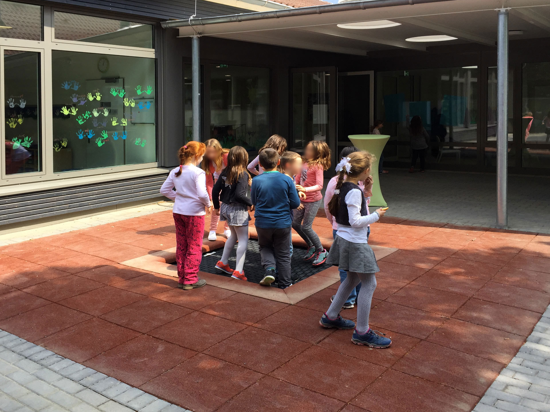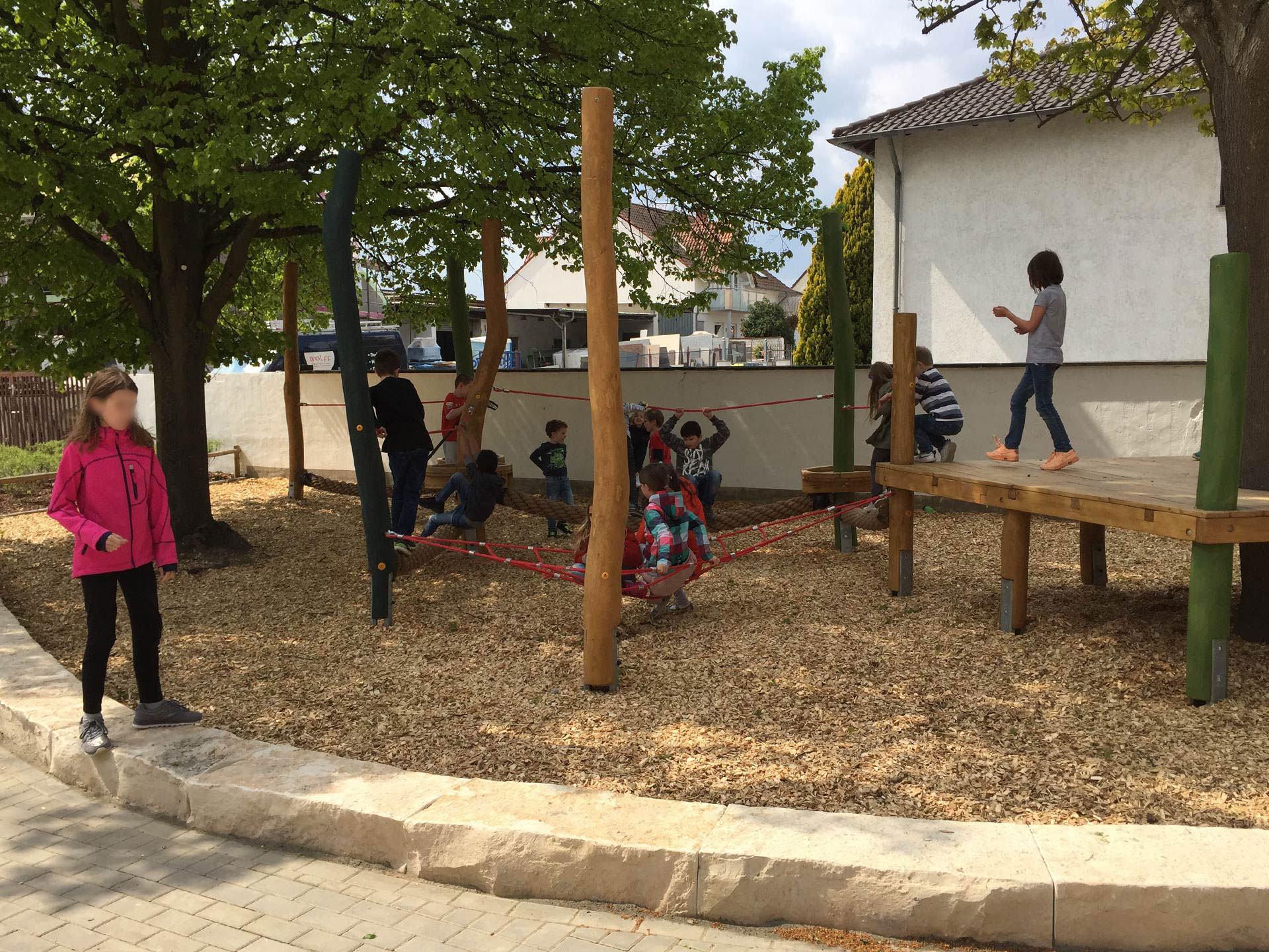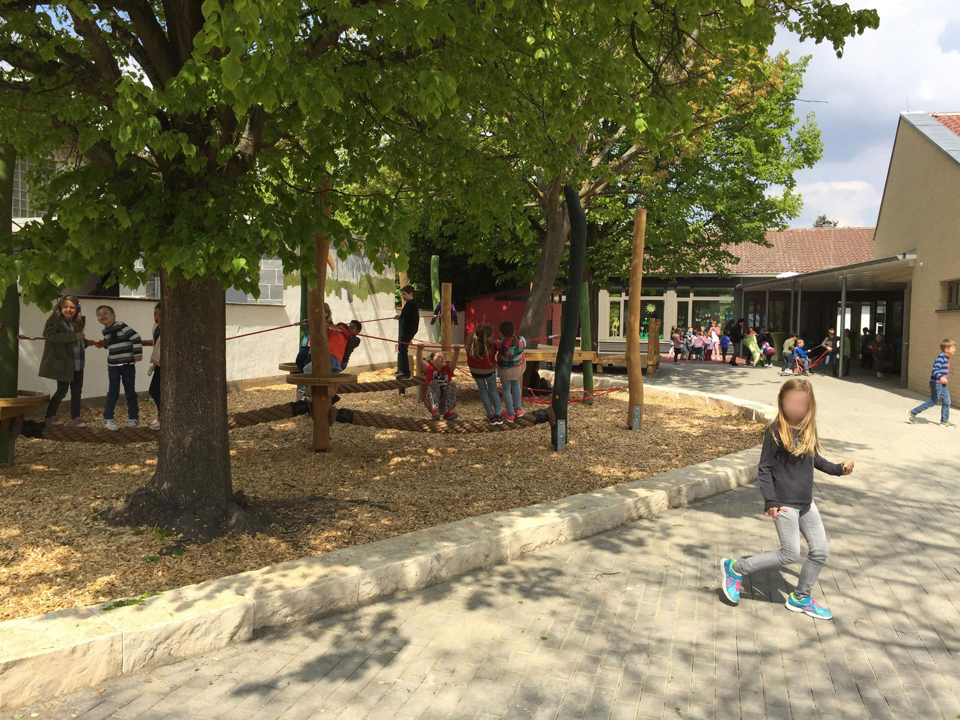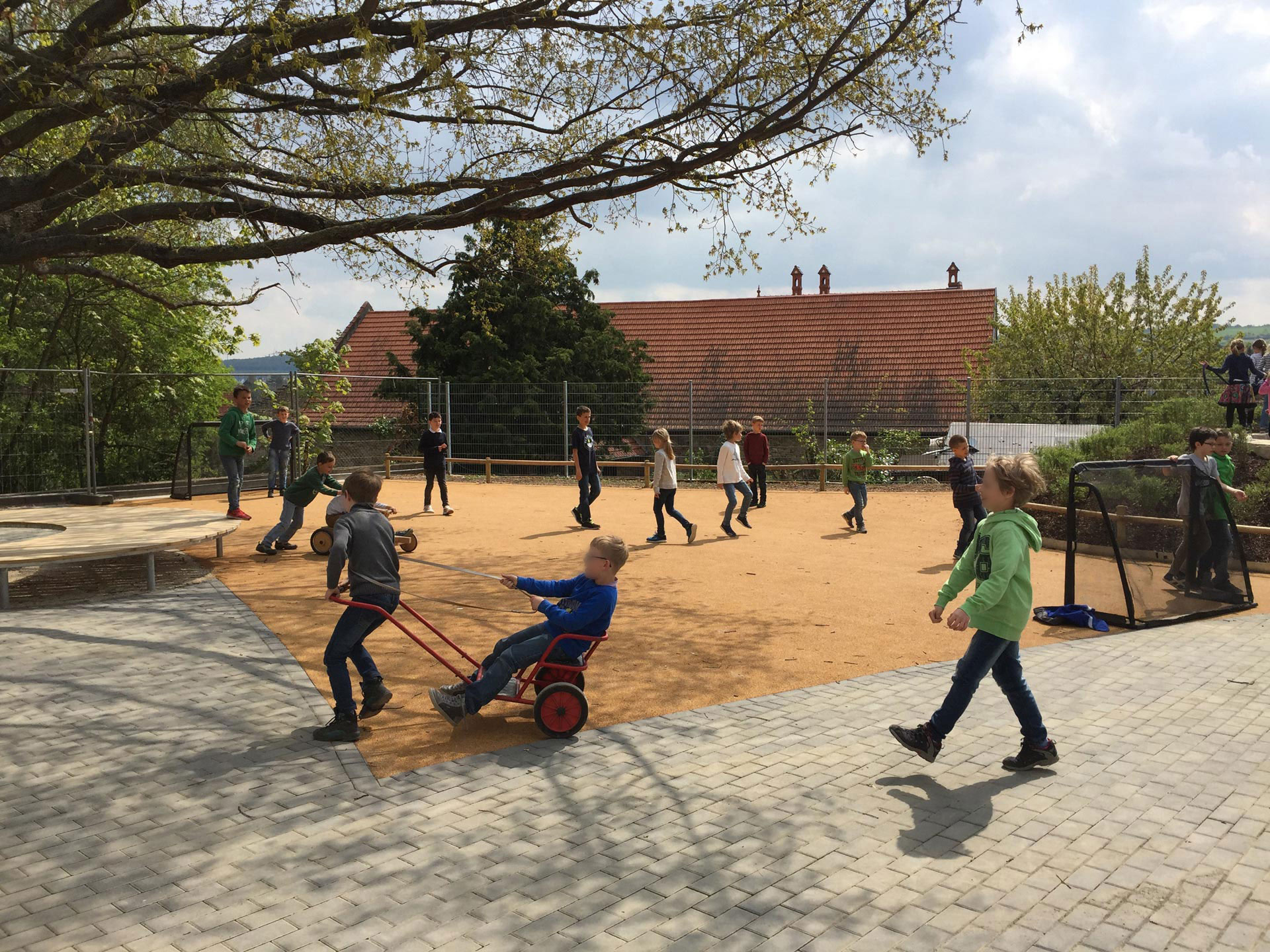 Im oberen Schulhof herrscht eine andere Atmosphäre. Harte, steinerne Flächen werden weich, mit Gummigranulatbelägen, wassergebundener Decke und Asthäcksel-Fallschutz. Eckige, kantige Formen sind gerundet, kommen in Bewegung und schwingen. Die mauergefasste Einfriedung wird ersetzt oder ergänzt durch Pflanzungen und hainartige Baumbestände. Aus Erde geformte Hügel und Wellen formen eine Hülle und bieten Schutz und Rückzug. Künstliche Baustoffe wie Beton und Stahl werden durch natürliche Materialien wie Natursteine, Sand, Kies, Holz und Erde ausgetauscht.