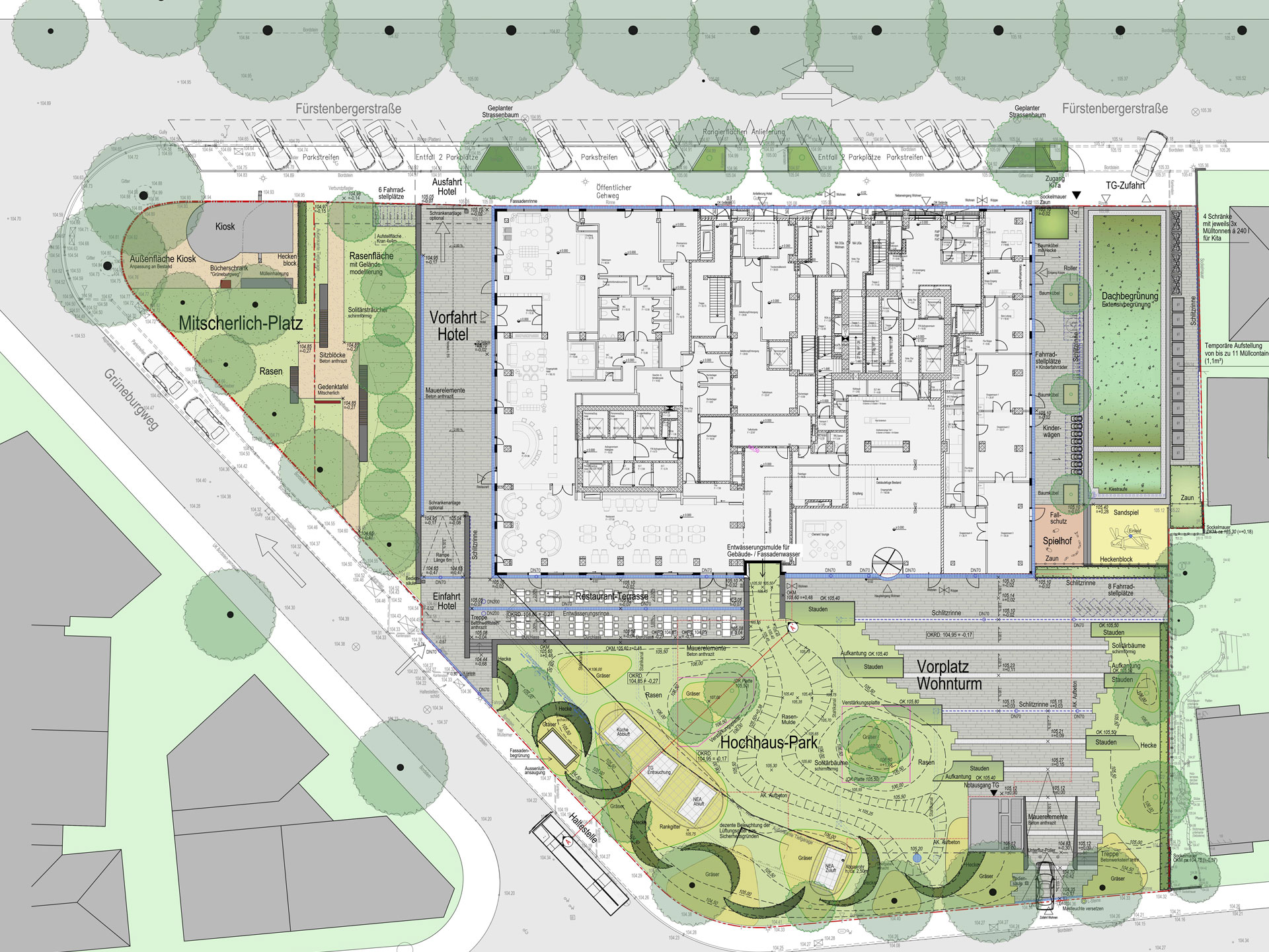 Der als öffentliche Grünanlage festgesetzte Mitscherlich-Platz wird in das Gestaltungskonzept einbezogen. Der hier geplante pocket-park setzt sich aus privaten und öffentliche Flächen zusammen und beinhaltet auch einen Kiosk mit Außenflächen.
