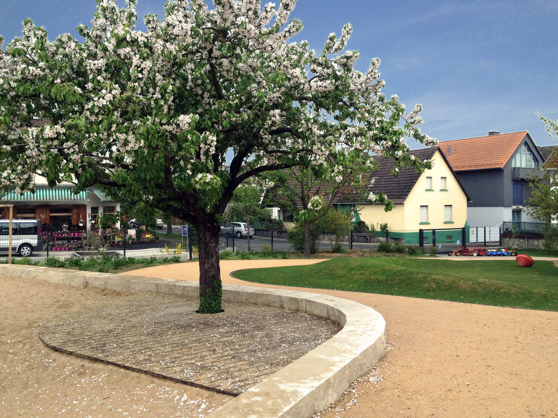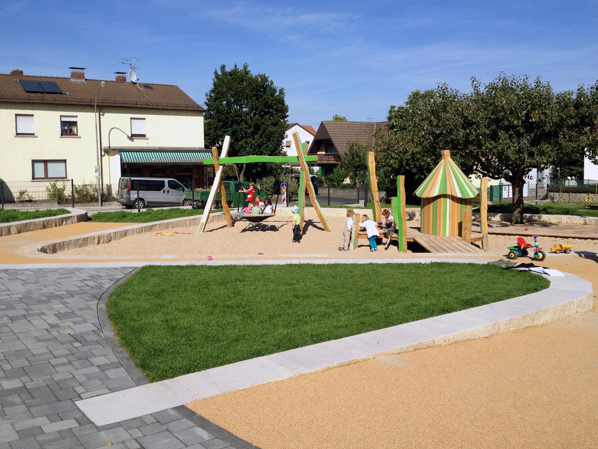 Auf den abgeräumten Flächen ist ein kunterbunter Kindergarten entstanden. Schwungvolle Linien begrenzen und verbinden mehrere Bereiche mit unterschiedlichen Themen und Angeboten: Hügel mit Rutsche, Matschbereich, Buddelbude, Vogelnest-Schaukel, See-Boje, Holzdeck und Weiden-Dschungel. Die Wegeflächen bestehen aus farbigem Fallschutzbelag und die Rasenflächen sind zur kuscheligen Mulde geformt.