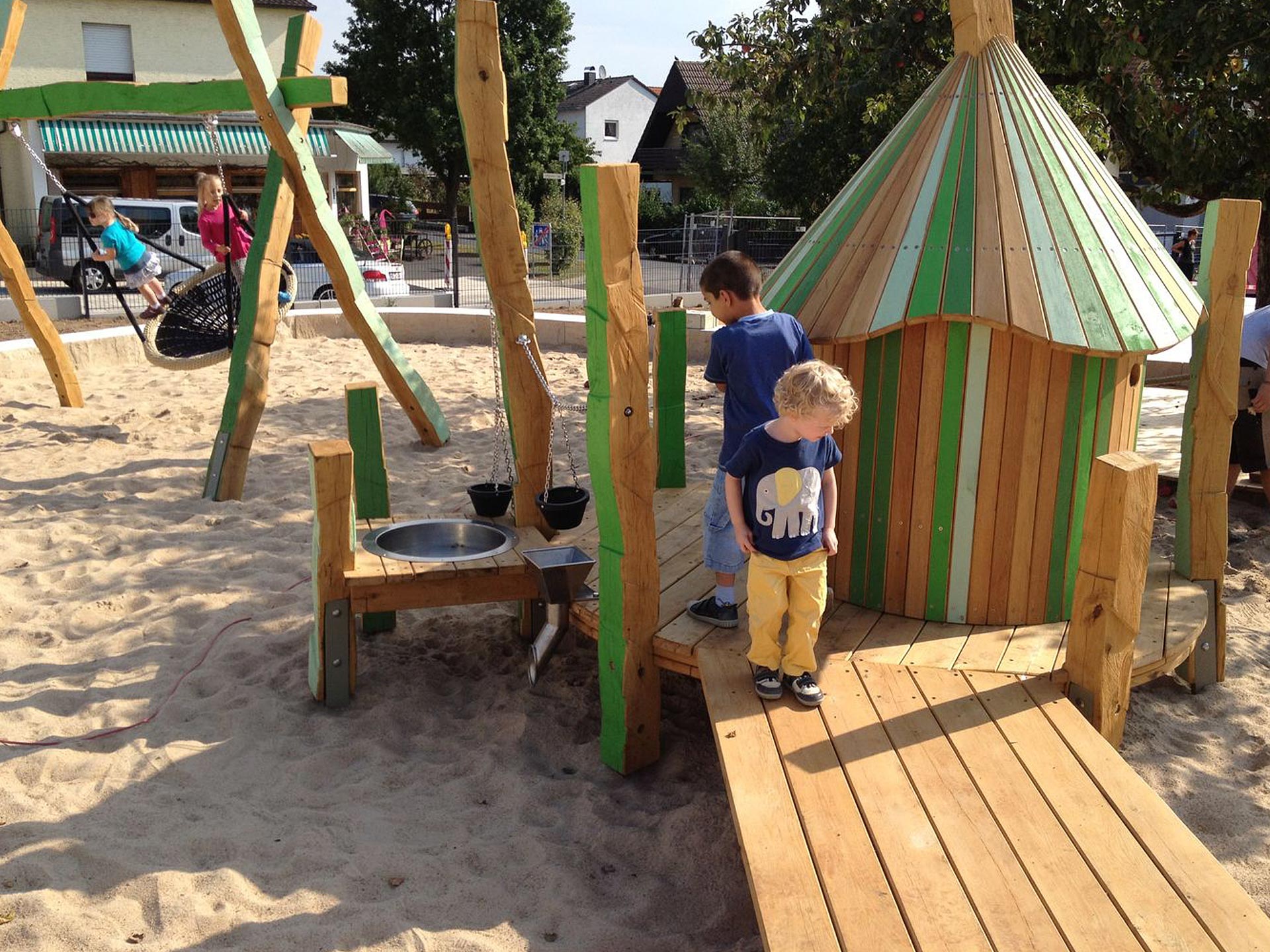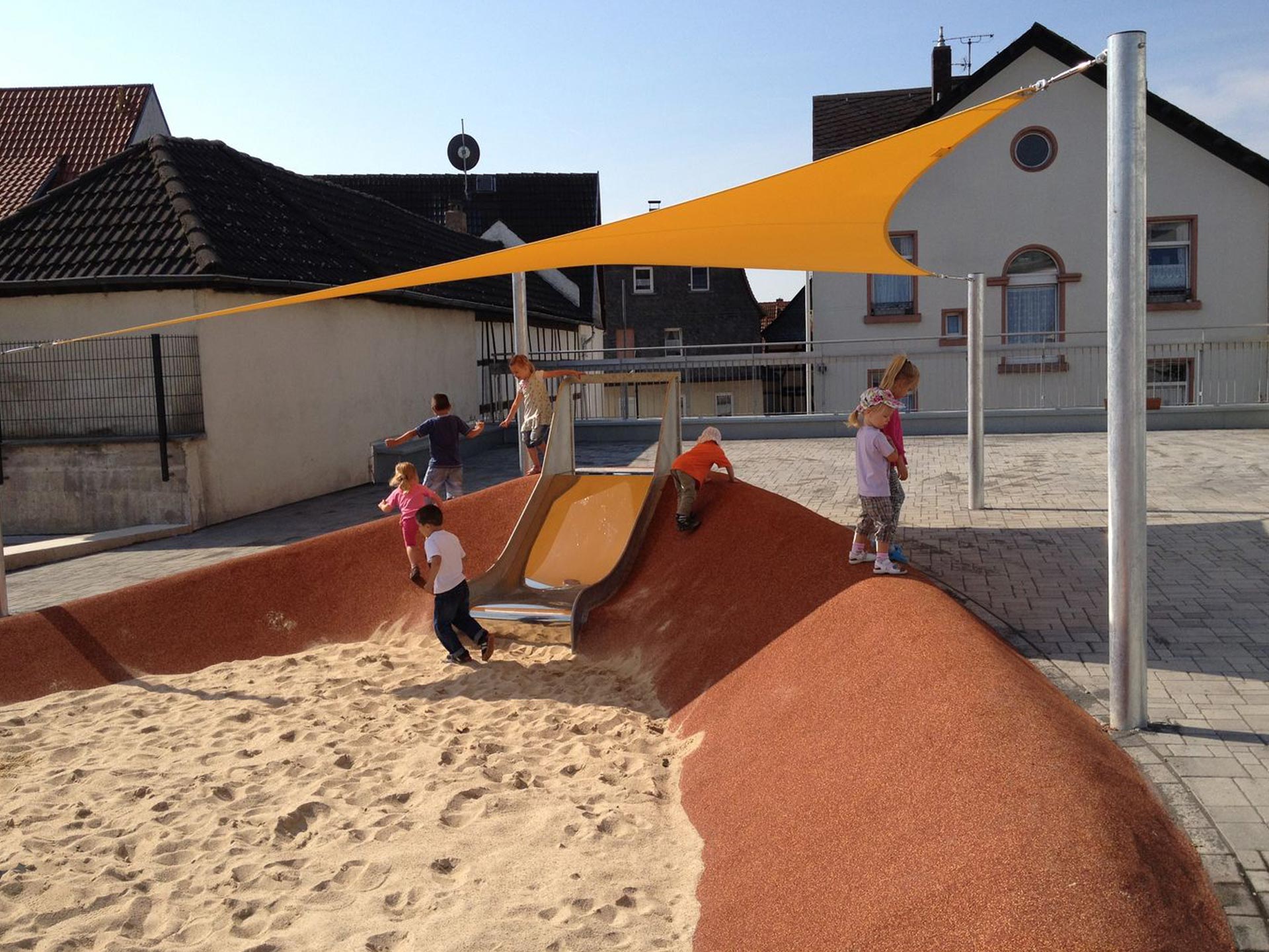Die Spiel-Landschaft, in der jeder Quadratmeter als Kindergarten gestaltet und genutzt wird, wird nicht nur dem steinernen Zeugen eine Weile Vergnügen bereiten.