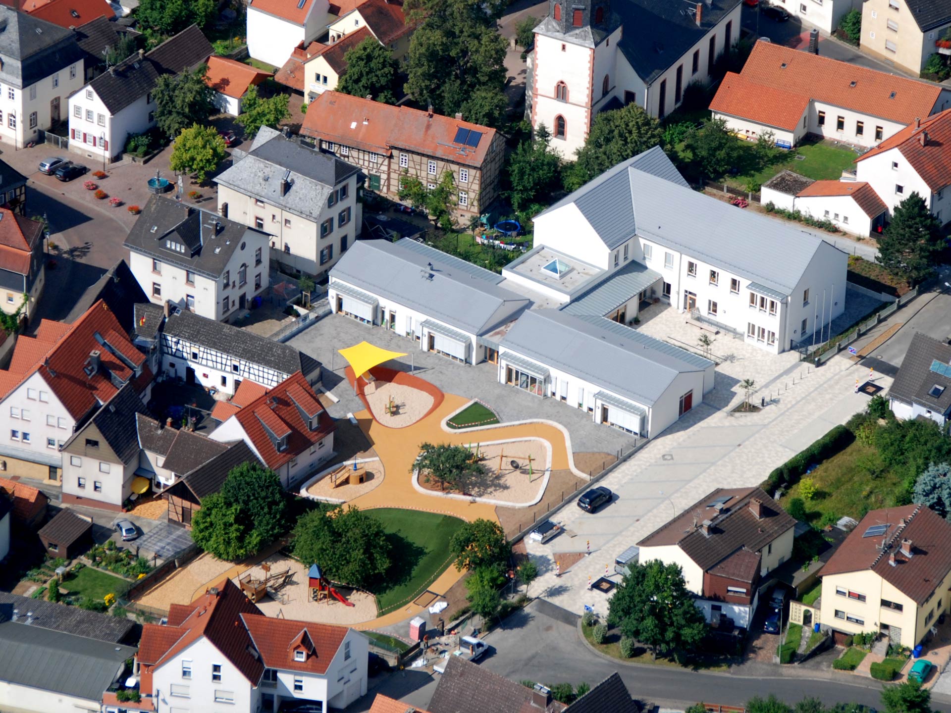 Wie ein neugieriger Beobachter streckt sich der Turm der Evangelischen Kirche in die Höhe, um so die beste Aussicht auf das neue Kinderhaus zu bekommen. Die vormalige Grundschule war schon viel zu lange in die Jahre gekommen. Bis auf einen erhaltenswerten Gebäudeflügel wurde alles abgerissen, ein zweigliedriger Neubau errichtet und die beiden Häuser mit einer nach beiden Seiten verglasten Cafeteria verbunden. Jetzt ist auch der Blick in die Bergstraße wieder frei.