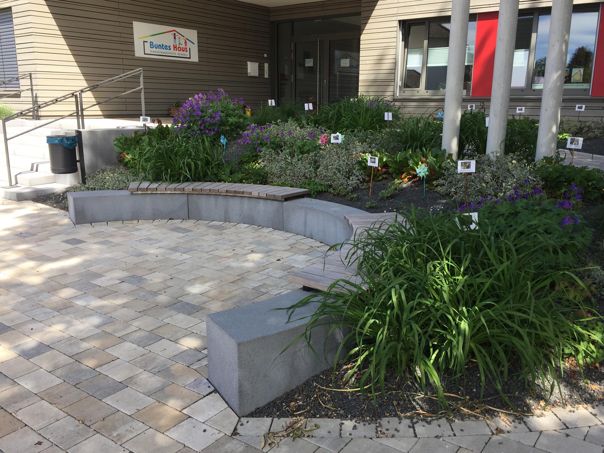 Der Neubau präsentiert sich zur Römerstraße mit einem einladend gestalteten Vorplatz mit Verweilmöglichkeit. Eine barrierefreie Zuwegung führt vom Vorplatz durch den Vorgarten und wird über die Terrasse am Mehrzweckraum als „Rundweg“ um den Neubau weitergeführt.