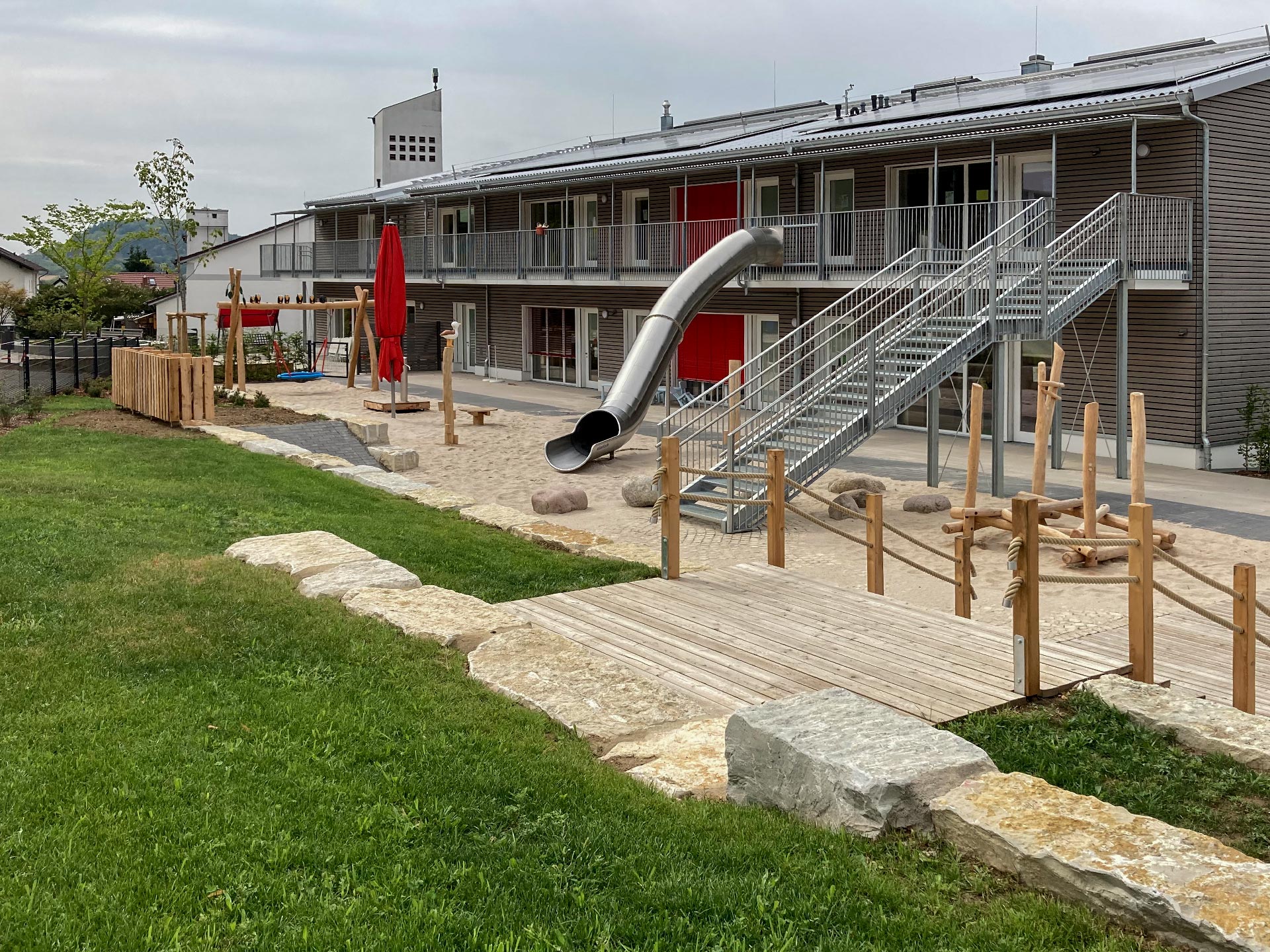 Die Freianlagen, insbesondere das Spielgelände, machen sich die natürliche Topografie des Geländes zu nutze. Der Spielbereich wird mit Plateaus unterschiedlicher Höhenniveaus ausgebildet. Die Höhenunterschiede werden durch Stützmauern aus Kalksteinblöcken abgefangen, bzw. werden über eine Holztreppe überwunden. Durch die Verwendung natürlicher Materialien und die konsequente Umsetzung des harmonischen Farbkonzeptes fügt sich das Freigelände, ebenso wie das Gebäude, in die natürliche Umgebung am Hang und zwischen die Bestandsgebäude ein. In den Freianlagen werden neben repräsentativen, intensiv begrünten Pflanzflächen auch funktionale und bespielbare Grünflächen integriert. Insbesondere der Spielbereich enthält neben der grünen und natürlichen Gestaltung punktuell eingesetzte Highlights, wie zum Beispiel die Röhrenrutsche vom Laubengang bis in den großen Sandsee.