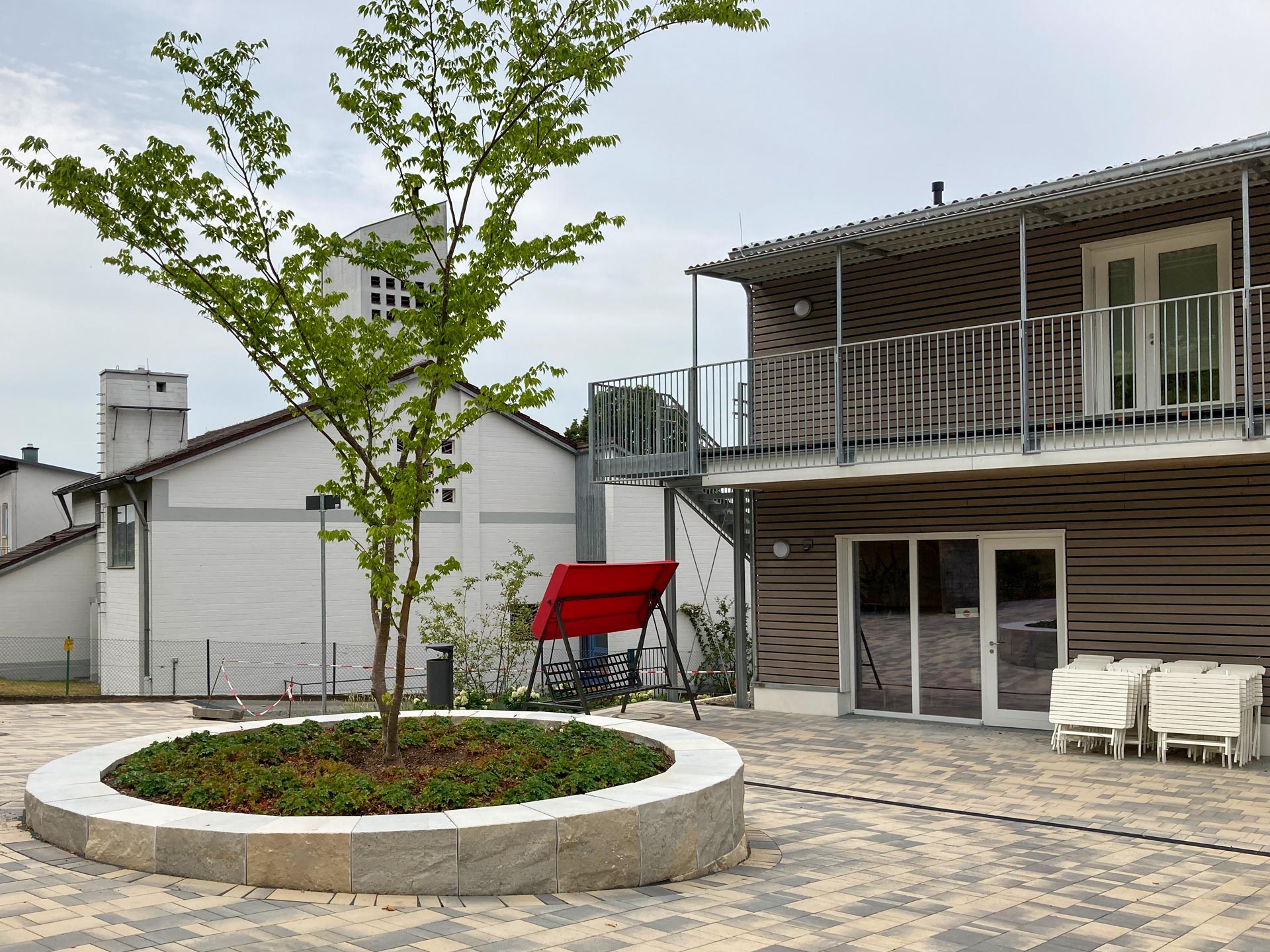 Neben dem großen Spielgelände für Kinder verschiedener Altersklassen im Süden entstehen darüber hinaus neue Parkmöglichkeiten sowie ein repräsentativer Vorplatz im Norden des Gebäudes, der als Hauptzugang dient. Im rückwärtigen Bereich entsteht ebenfalls eine platzartige Situation, die dem Multifunktionsraum zugeordnet ist und der Andienung des Gebäudes dient.