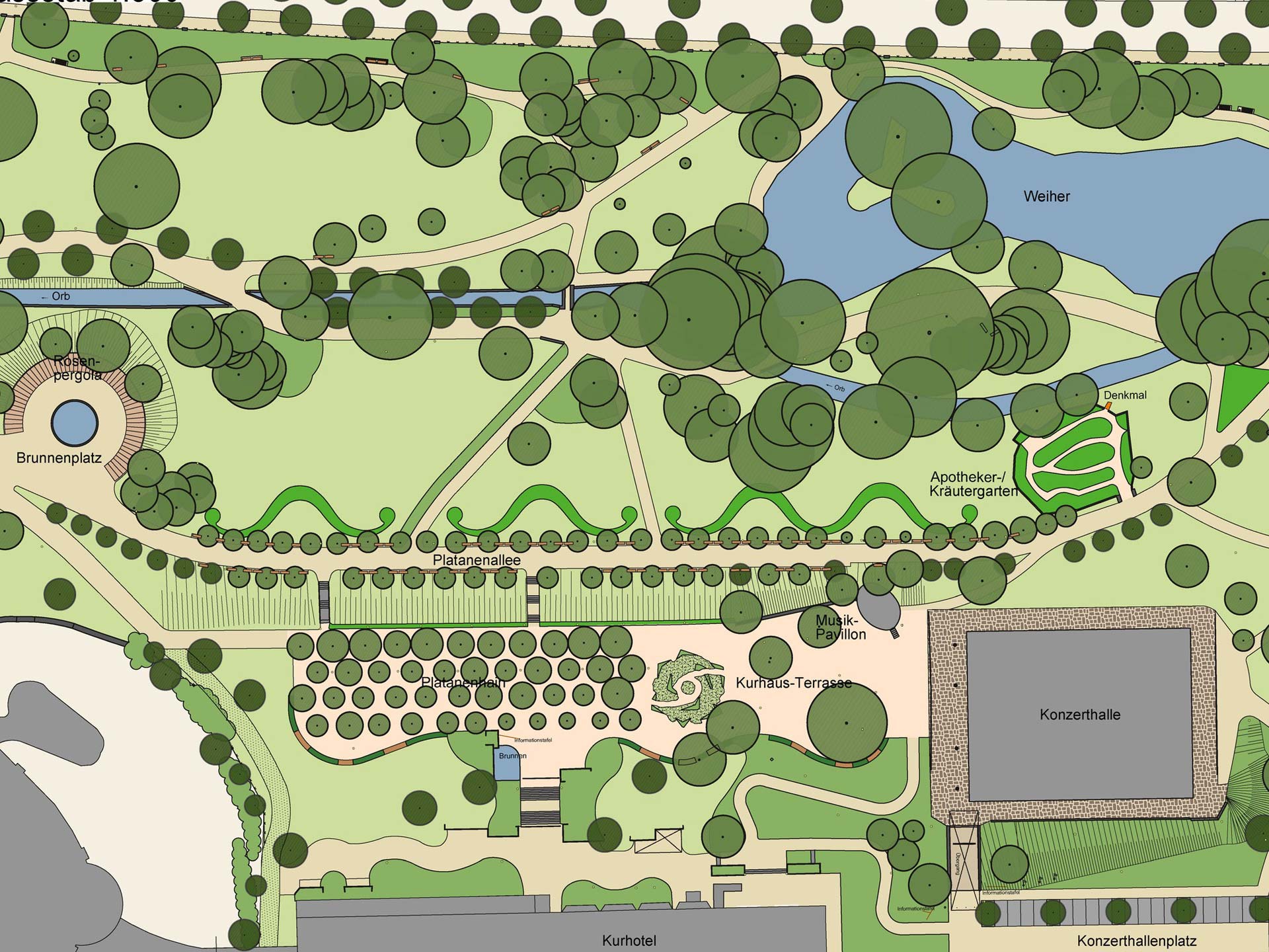 Äußerst bemerkenswert an dem Kurpark in Bad Orb ist eine integrierte Gesamtgestaltung aus architektonischen Strukturen und ihre Überlagerung mit landschaftlichen Elementen unter Einbeziehung historischer Bestände aus der Zeit als Salinenort.
