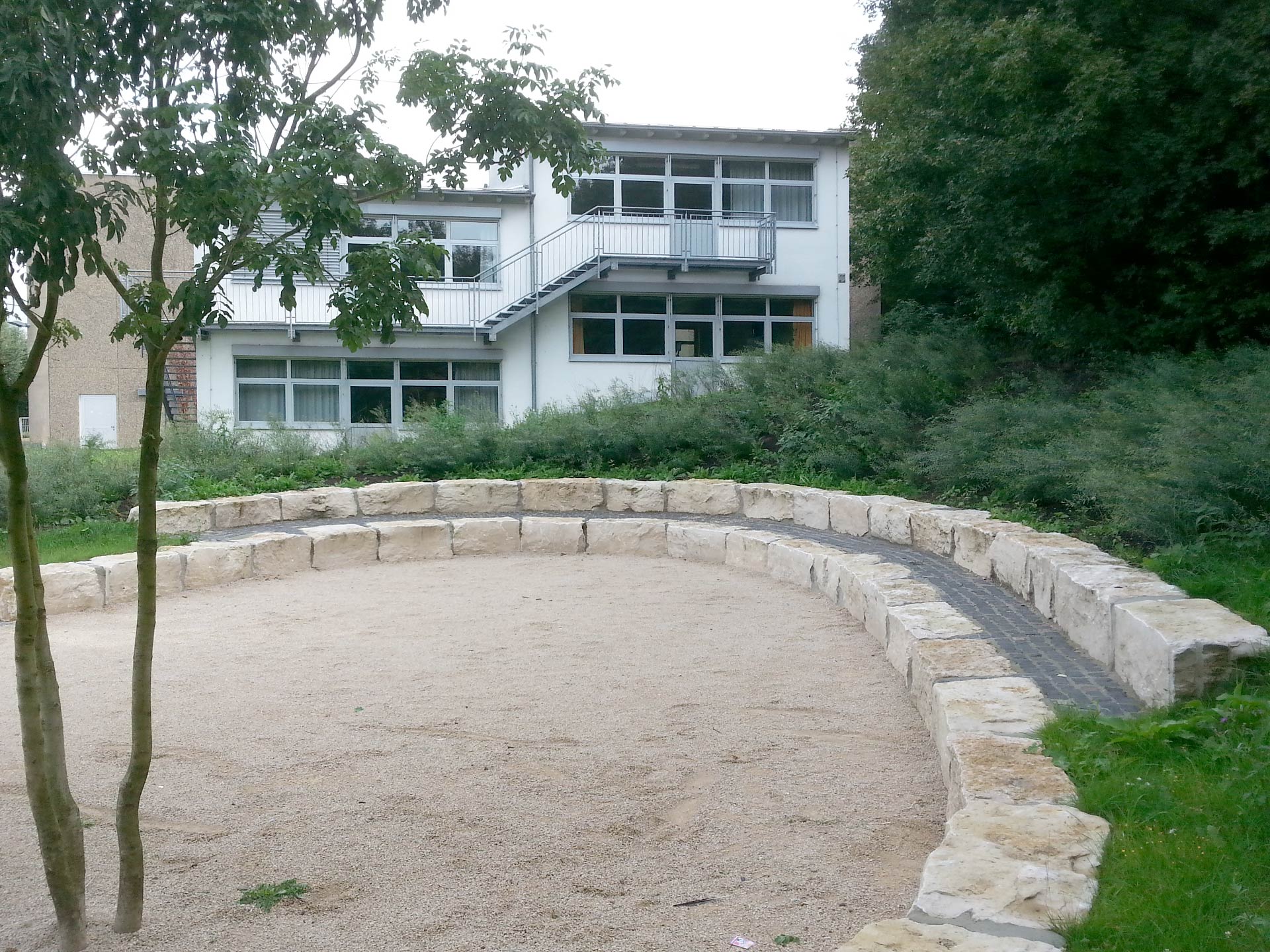 Mit der Einrichtung des Grünen Klassenzimmers wurde auf dem Schulgelände ein geschützter Rückzugsort für Erholung, Aufenthalt und Unterricht im Freien geschaffen. Eingebettet in die vorhandene, sanfte Geländetopographie, umsäumt von großen Bäumen und viel Grün, lädt dieser attraktive Freiraum mit großzügigen Naturstein-Sitzmauern zum Verweilen ein.