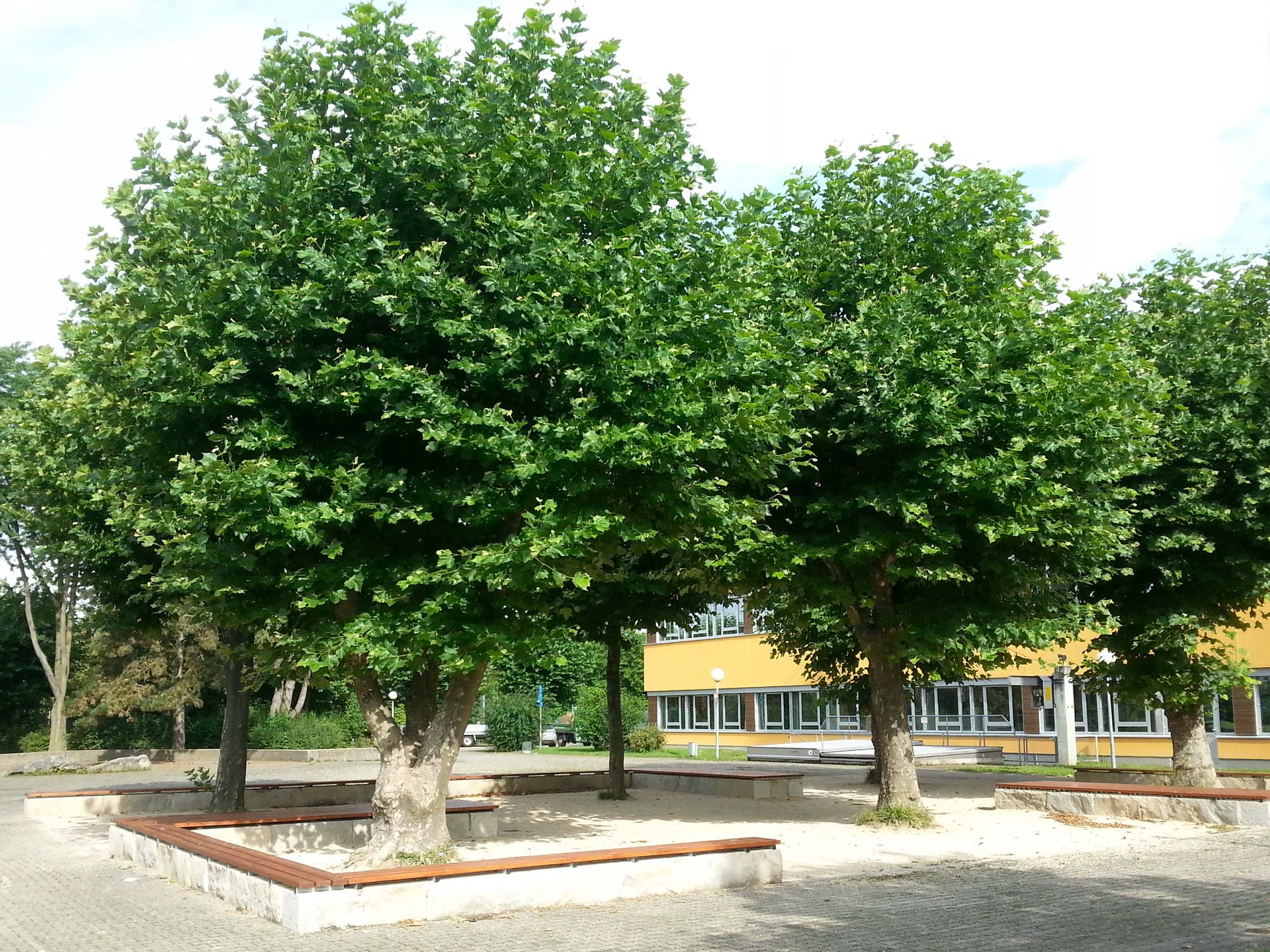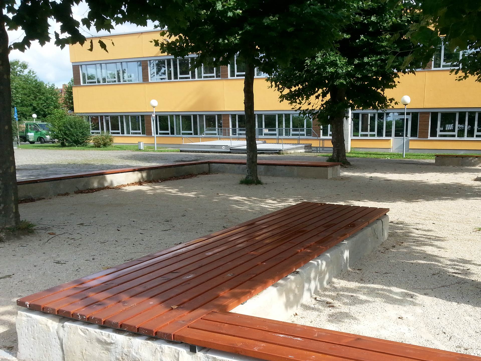 An anderer Stelle des Schulhofs wurde ein alter Baumbestand mit Platanen umgestaltet und neu in Szene gesetzt. Zur Strukturierung und Aufwertung des Freiraums dienen lineare Sitzbänke aus Naturstein mit Holzauflagen.