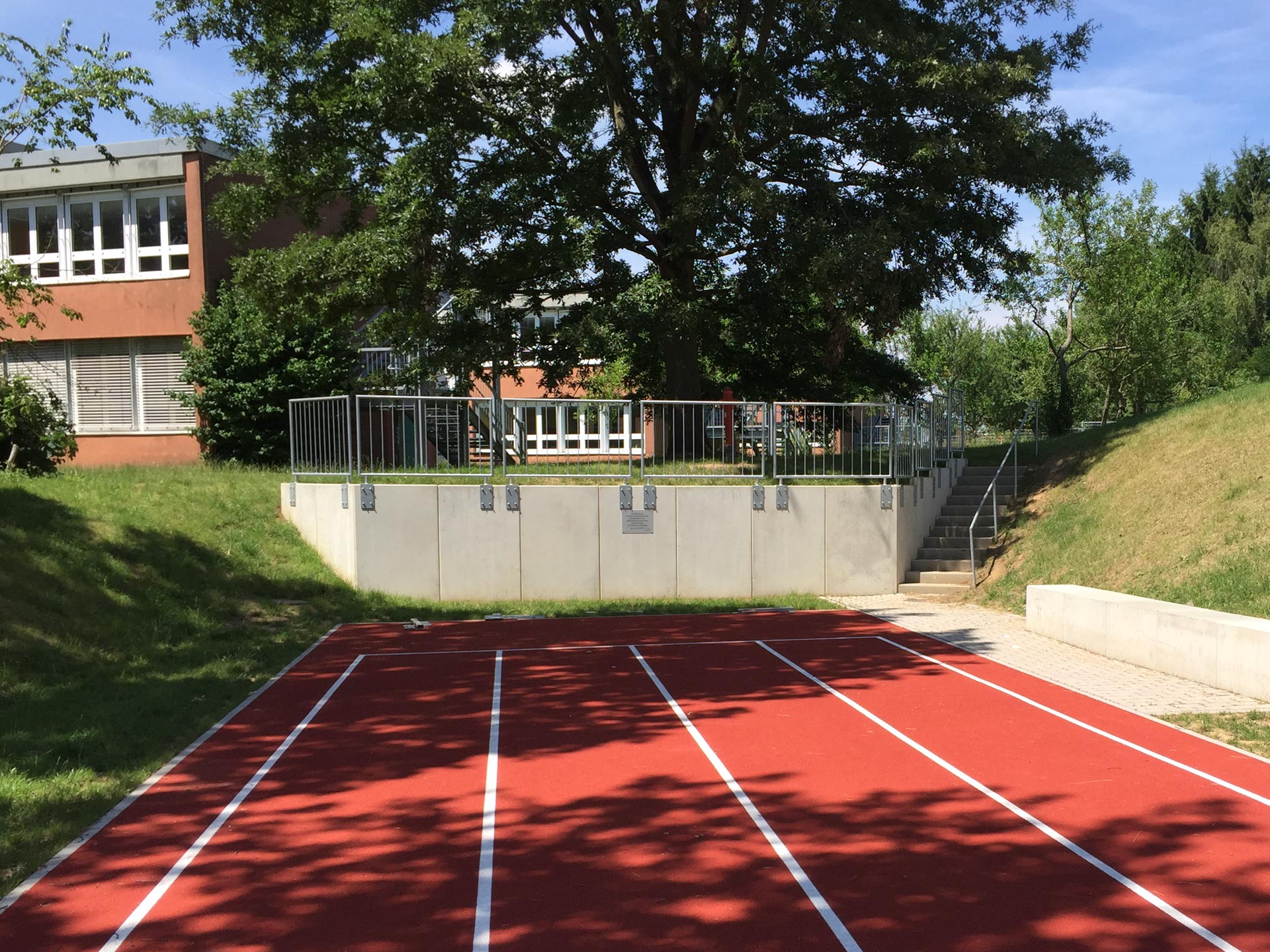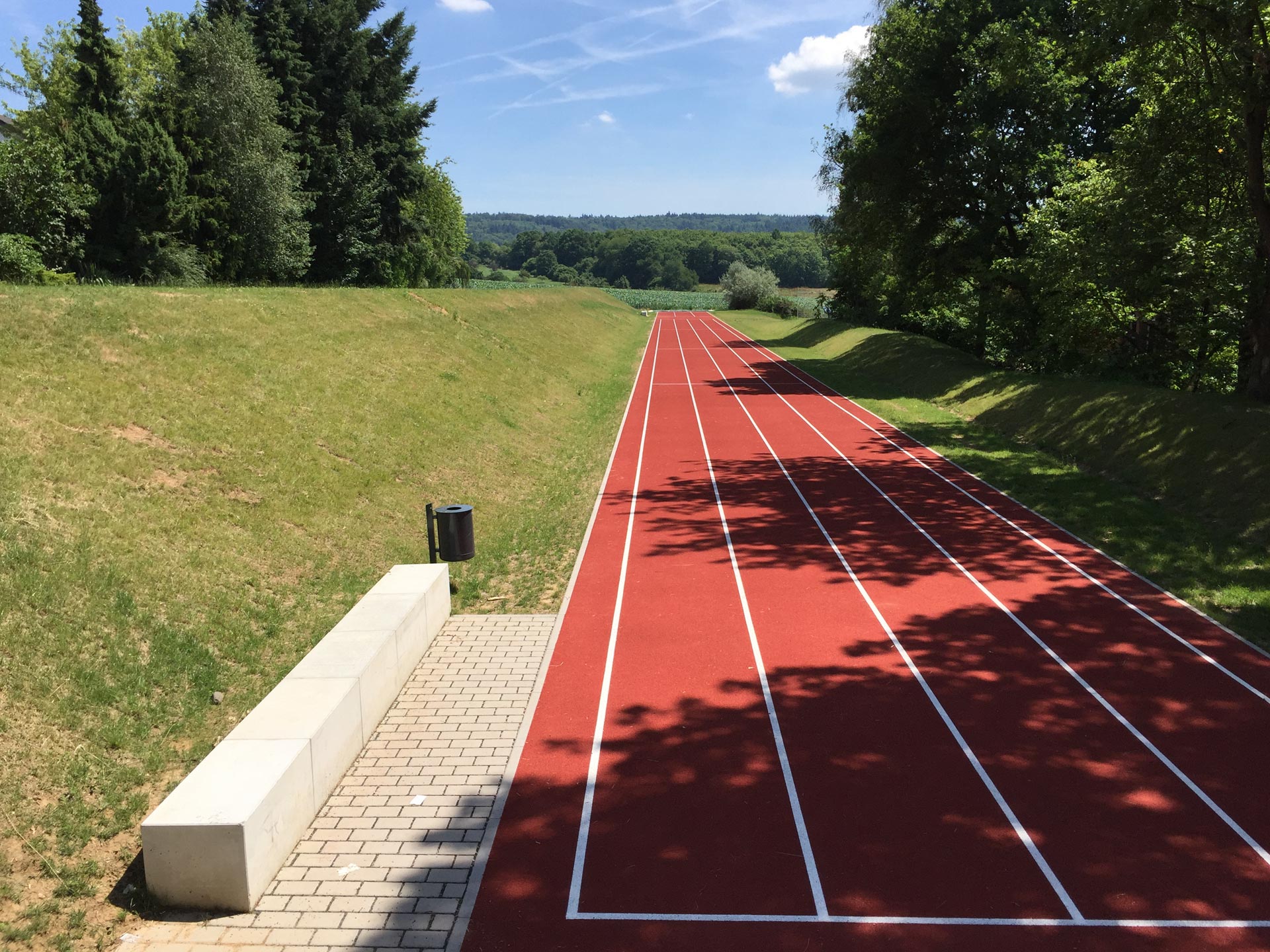 In topographisch bewegtem Gelände gelang es, eine 100 m Laufbahn mit einer Weitsprunganlage zu kombinieren. Insgesamt eine Anlage von knapp 150 m Länge. Die Planung erforderte den Einsatz traditioneller landschaftsgestalterischer Techniken in der Bodenbearbeitung und Geländemodellierung. Erst konnte man sich die Sportanlage in dem vorhandenen Gelände kaum vorstellen, nach der Fertigstellung konnte keiner glauben, dass das Gelände je anders war.