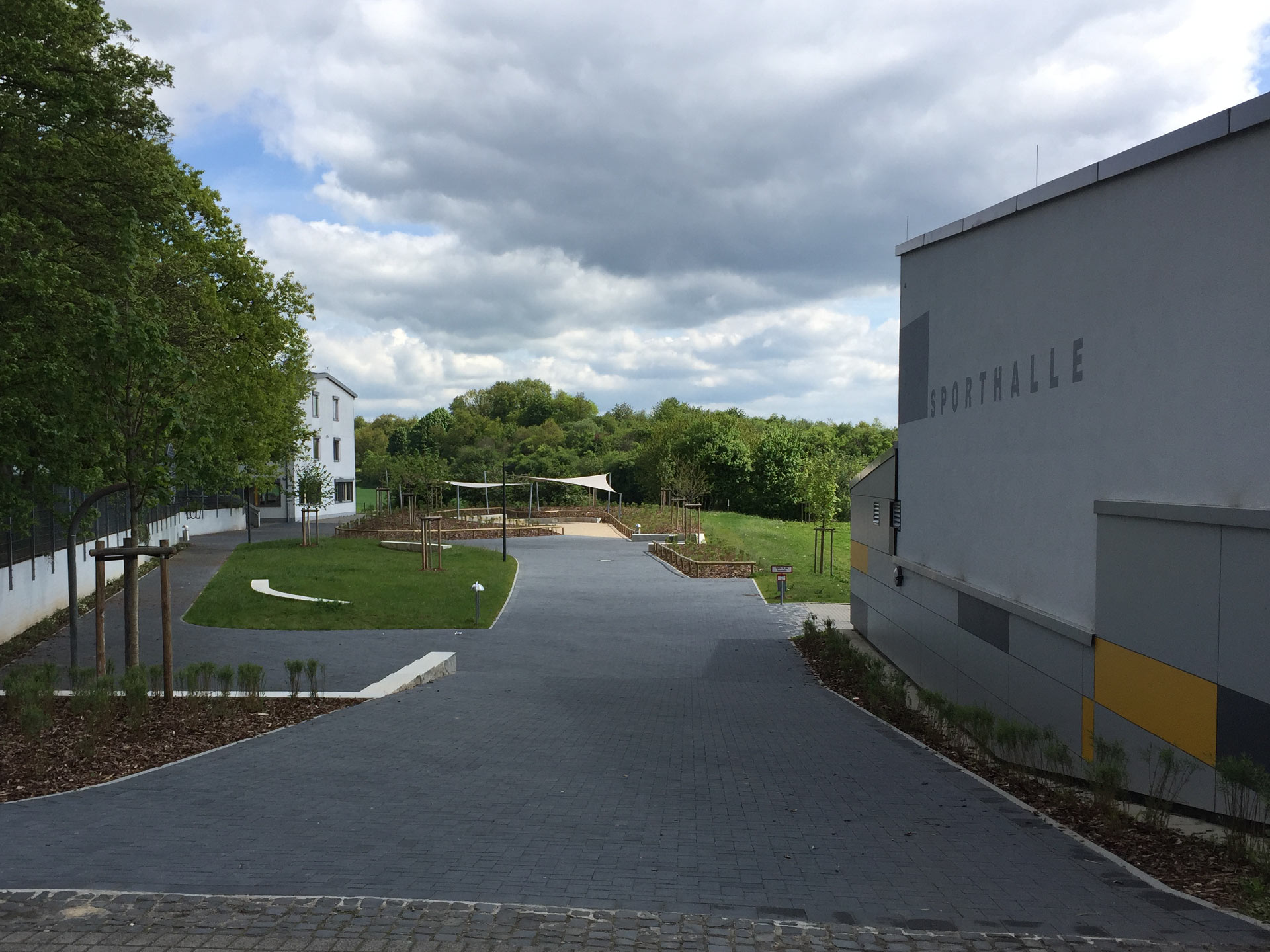 Kleine Rasenhügel begrenzen die Spielwiese gegenüber der gepflasterten Mitte des Schulhofes. Zur Bestandsmauer hin wird ein Teil der Asphaltfläche erhalten und als Wegeverbindung an der Mauer benutzt. Eine Aufweitung des Weges im Westen zu einem kleinen Spielfeld – vor dem um einige Meter versetzten und in Richtung der Wand gedrehten Streetballkorb – schafft einen neuen Bewegungsraum.