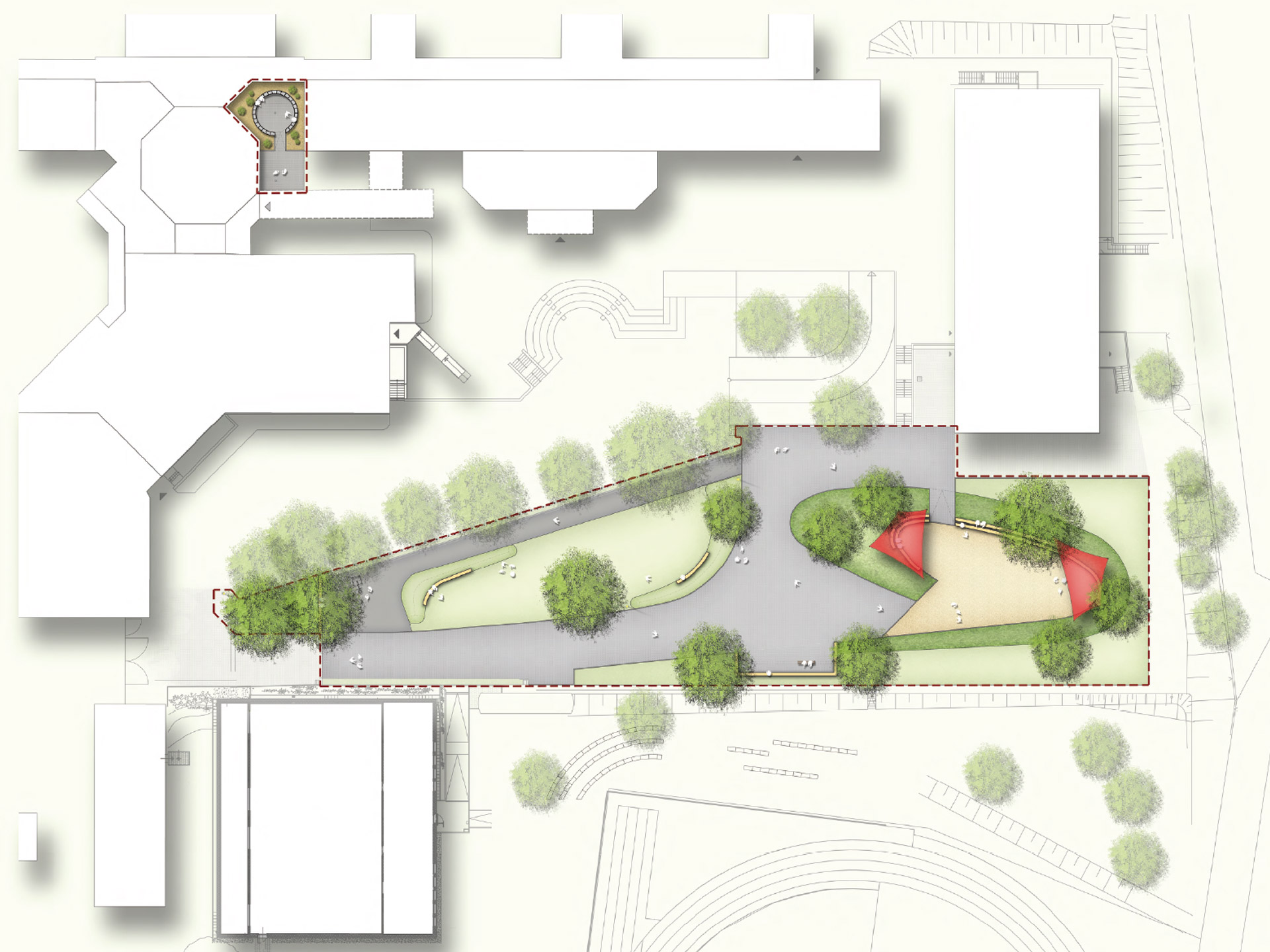 Ein wesentliches Element der neuen Schulhofgestaltung ist das im Osten geplante grüne Klassenzimmer. Eine bewegte kleine Hügellandschaft mit einzelnen Laubbäumen und einer Pflanzung aus kompakten Weiden bildet den Rahmen um einen abgesenkten Innenraum. Dort werden Sitzblöcke aus Kalkstein in mehreren Reihen am Rand der ovalen Modellierung übereinander angeordnet, die einen Unterricht im Freien oder auch kleine Veranstaltungen ermöglichen.