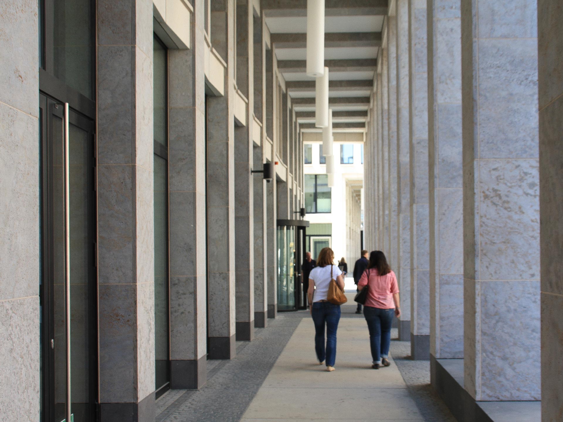 Die höhenmäßig gestaffelten und von mehreren Architekten gestalteten Gebäude bilden ein räumlich strukturiertes Ensemble aus Arkaden, Gassen, Straßen und Plätzen. Im zentralen Platz treffen sich alle Verbindungen. Eine ornamentartig gegliederte Grünanlage mit einem zentral positionierten Wasserbecken besetzt diesen Raum. Sie zieht aus allen Richtungen die Blicke auf sich, lädt zum unverbindlichen Aufenthalt ein und gewährt den kurzzeitigen Rückzug aus dem hektischen Treiben. Eine flächig umhüllende und atmosphärisch wirksame Beleuchtung zaubert in den Abendstunden einen besonderen Ort hervor, zumal sich diese Lichtinszenierung von der regulären Straßenbeleuchtung im Umfeld besonders charakteristisch abhebt.