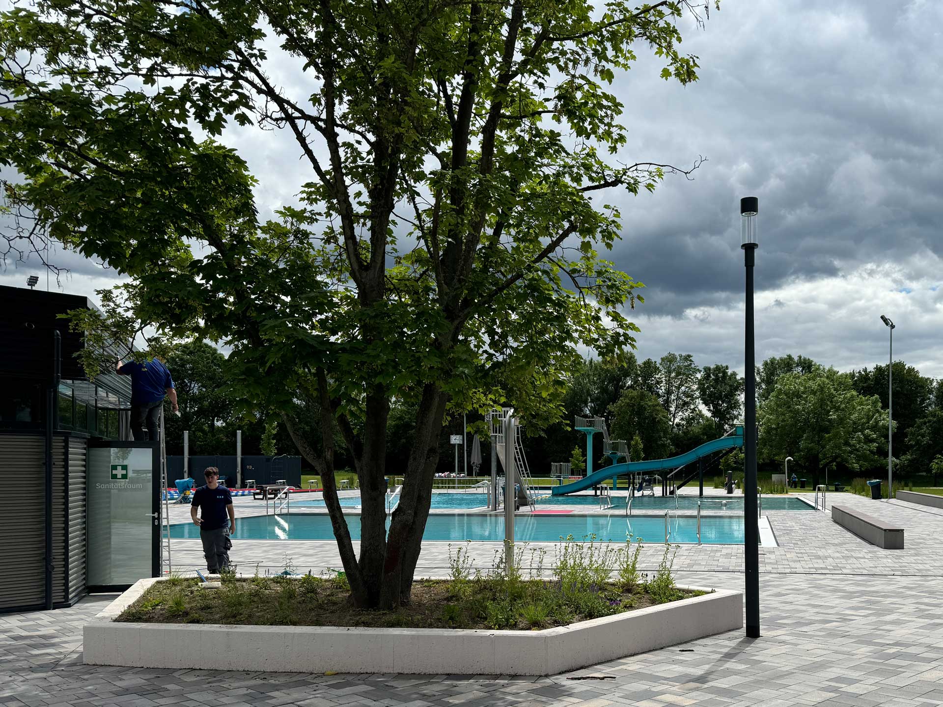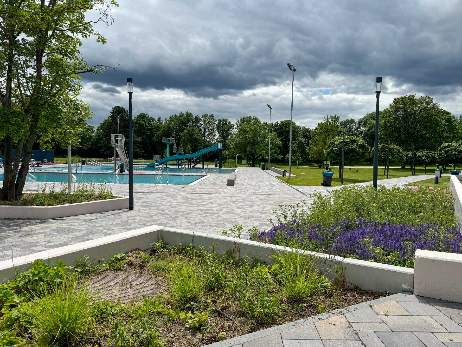Die Planung schafft eine neue bewegte Landschaft, in dem Staudenbeete mit einem hohen Gräseranteil als neues raumbildendendes Element eingeführt wird. Als zentraler Bestandteil des Freibades wird die Badeplatte künftig wesentlich großzügiger gestaltet und durch Sitzmauern aus hochwertigen Betonele-menten mit WPC Holzauflagen gegliedert. Eine barrierefreie Erschließung wird zukünftig durch Ergänzung einer Rampenanlage in die vorhandene Treppenanlage der Erschließungsachse, zwischen Hallenbad und Freibad, gewährleistet.
