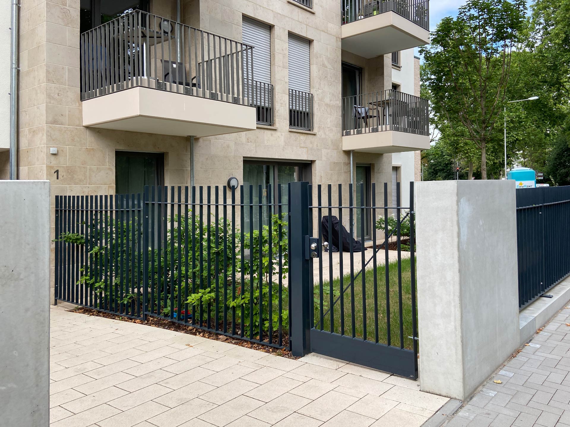 Das Grundstück wird gegenüber der Straße durch niedrige Einfassungsmauern und Zäune eingefriedet. Die Zugänge zu den einzelnen Gebäuden sind mit Toren ausgestattet. Damit wird sowohl eine Stärkung der räumlichen Begrenzung des Areals als auch eine zum Teil transparente Abschirmung zum anschließenden Straßenraum erreicht. Alle Gebäude werden barrierefrei erschlossen.
