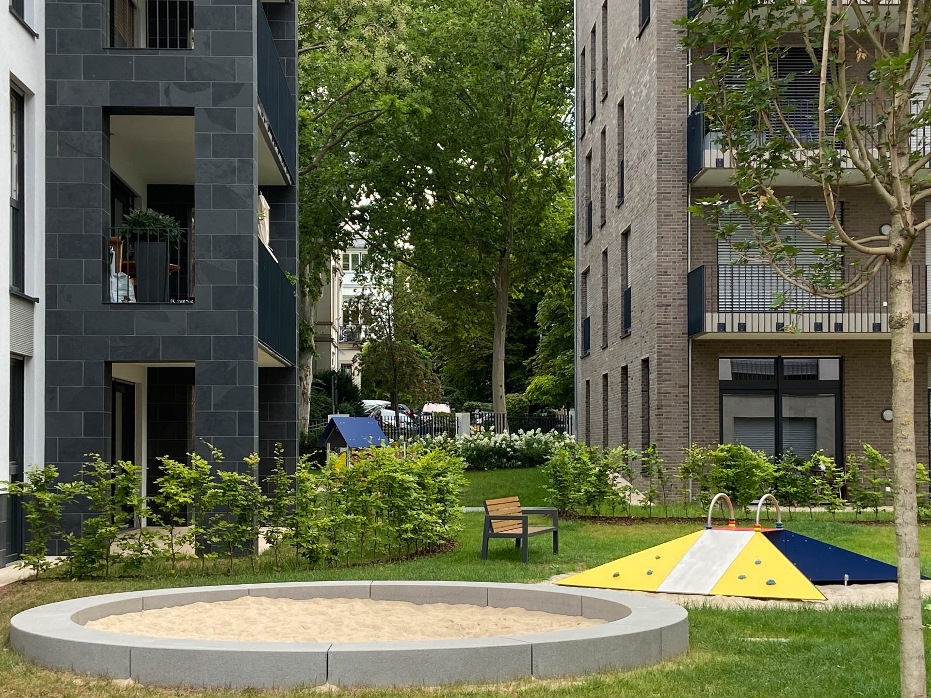 Die rückwärtige Gartenzone wird in Form einer intensiven Dachbegrünung über der Tiefgarage hergestellt. Einige großkronige Laubbäume bilden die räumlich wirksame Kulisse des Villenquartiers. Ein Teppich aus Stauden und Gräsern ergänzt mit punktuellen Solitärsträuchern bildet ein einheitliches Motiv, in das alle Gebäude eingebettet werden. Durch diesen Gestaltungsansatz wird die parkartige Gesamtwirkung der Anlage unterstützt und eine Parzellierung in einzelne unterschiedlich gestaltete Gärten vermieden.
