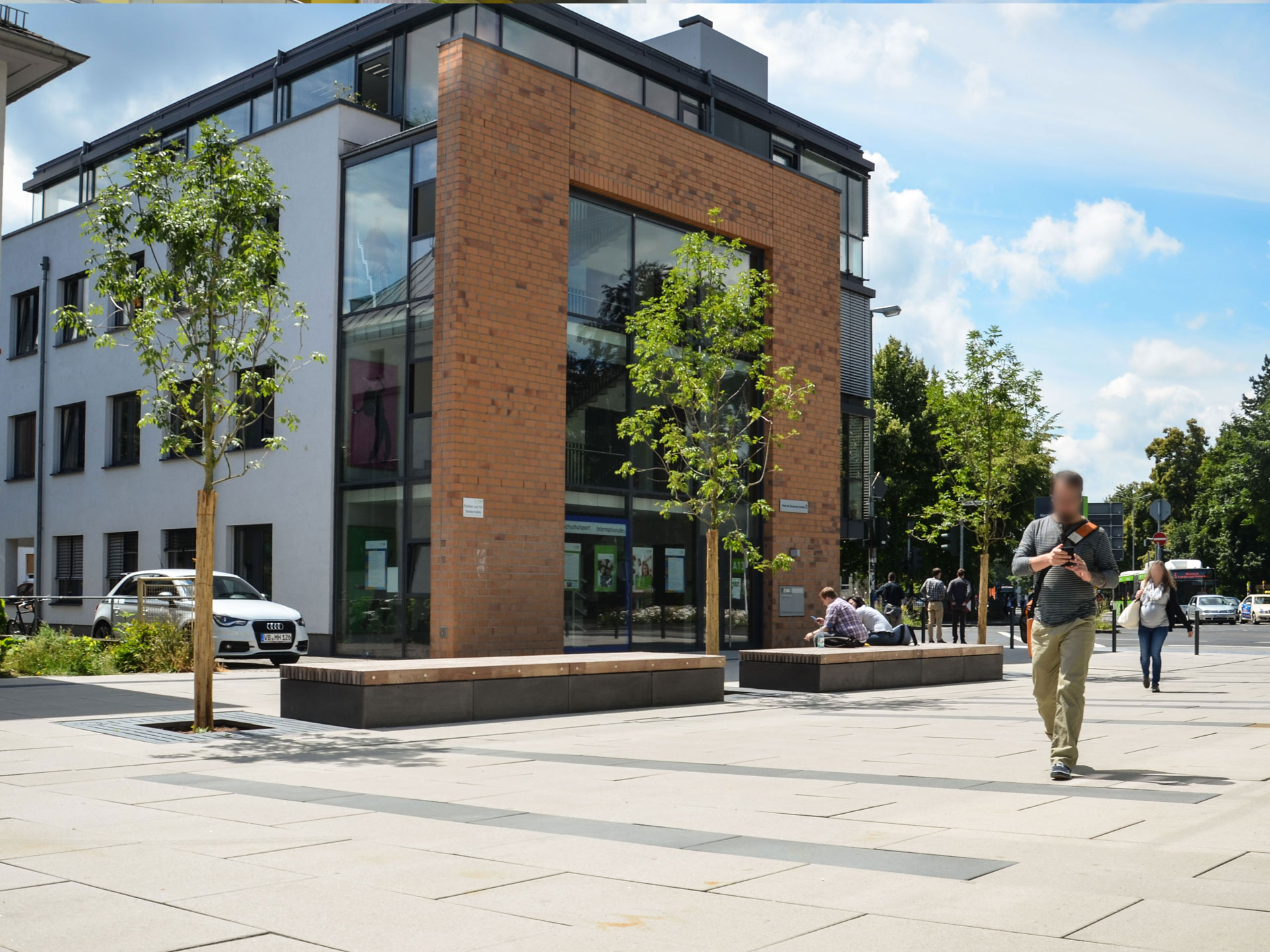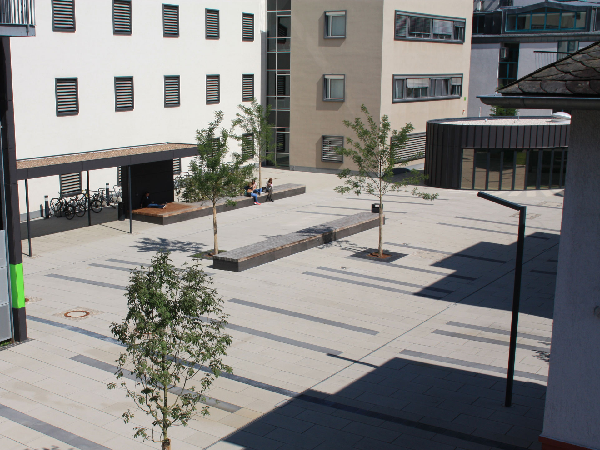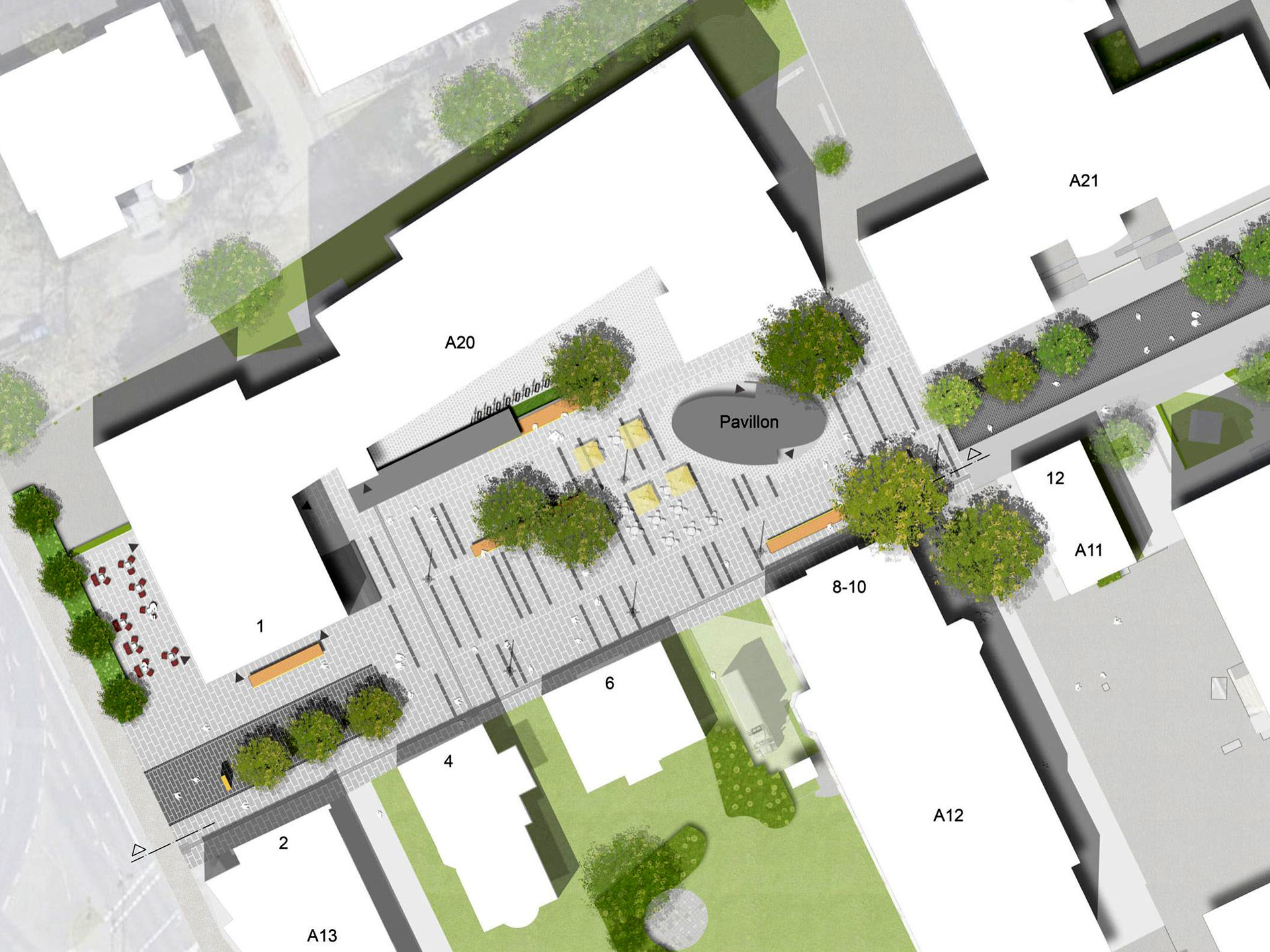 Der Freiraum ist als öffentlicher Stadtraum konzipiert und zeichnet sich durch eine Folge von Plätzen, kleinen Gassen und Verbindungsräumen aus. Freiraumgestalterische Mittel und Materialien spielen eine bedeutende Rolle. Einheitliche Bodenbeläge, nach ähnlichen Prinzipien strukturiert, bilden das verbindende Element. Auf die Bänderung des Bodenbelags abgestimmte Möblierungen aus linearen Bankelementen, Leuchtstreifen und Bäumen erzeugen eine identitätsfördernde Aufenthaltsqualität.