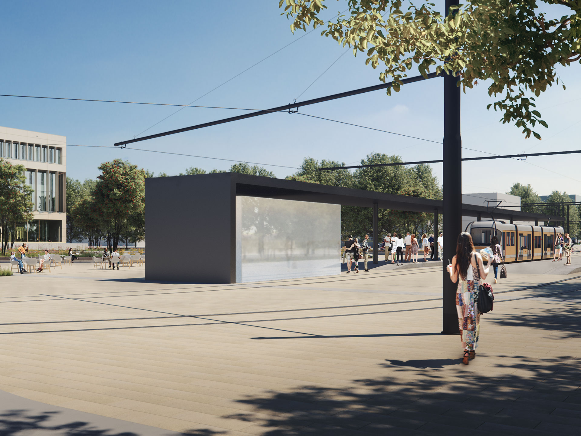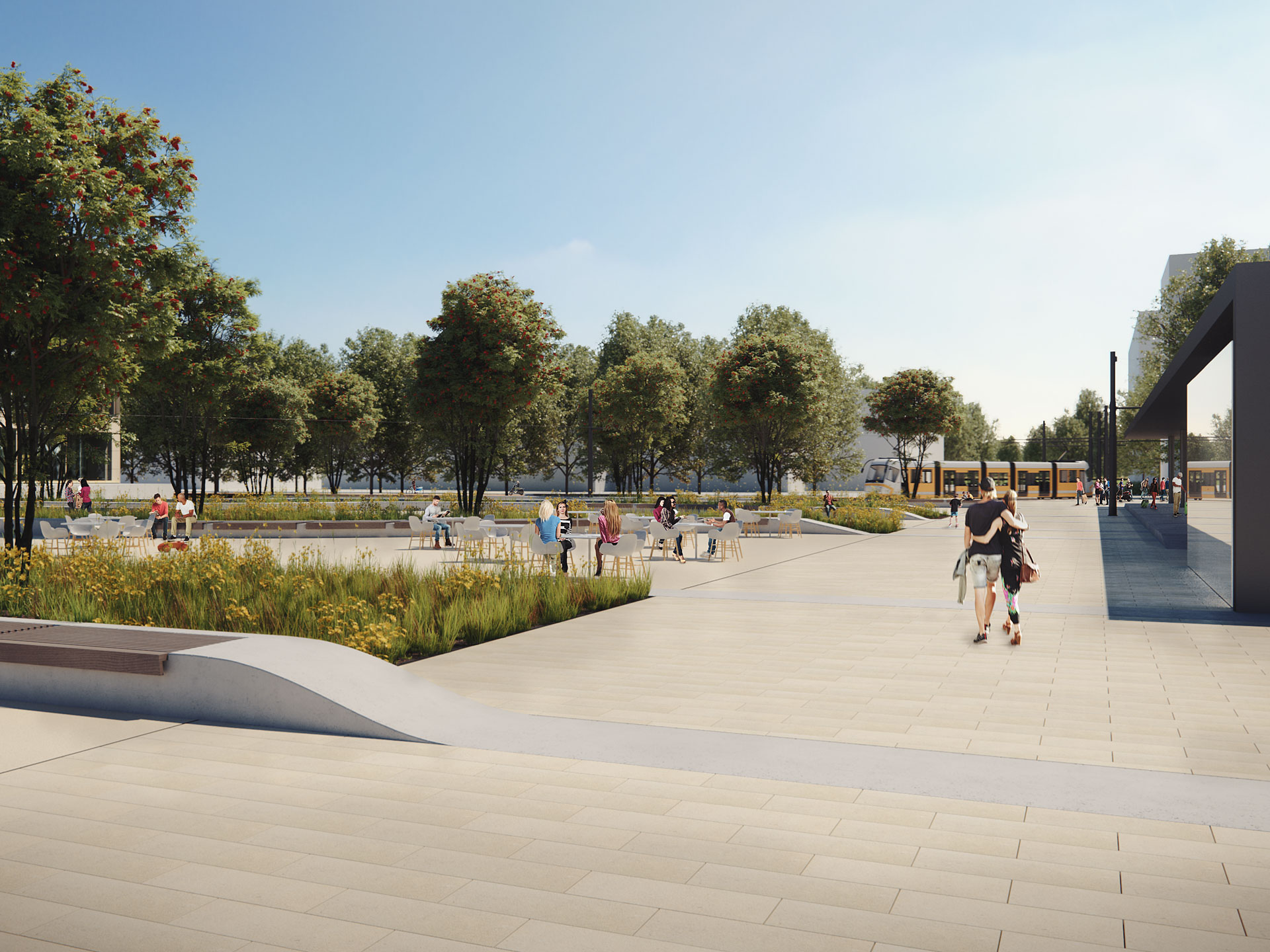 Den Auftakt bildet der Platz an der Wendeschleife der Straßenbahn. Hier werden eine neue Haltestation und eine neue Bushaltestelle eingerichtet. Der Platz wird zum Knotenpunkt der verschiedenen Verkehrsströme.