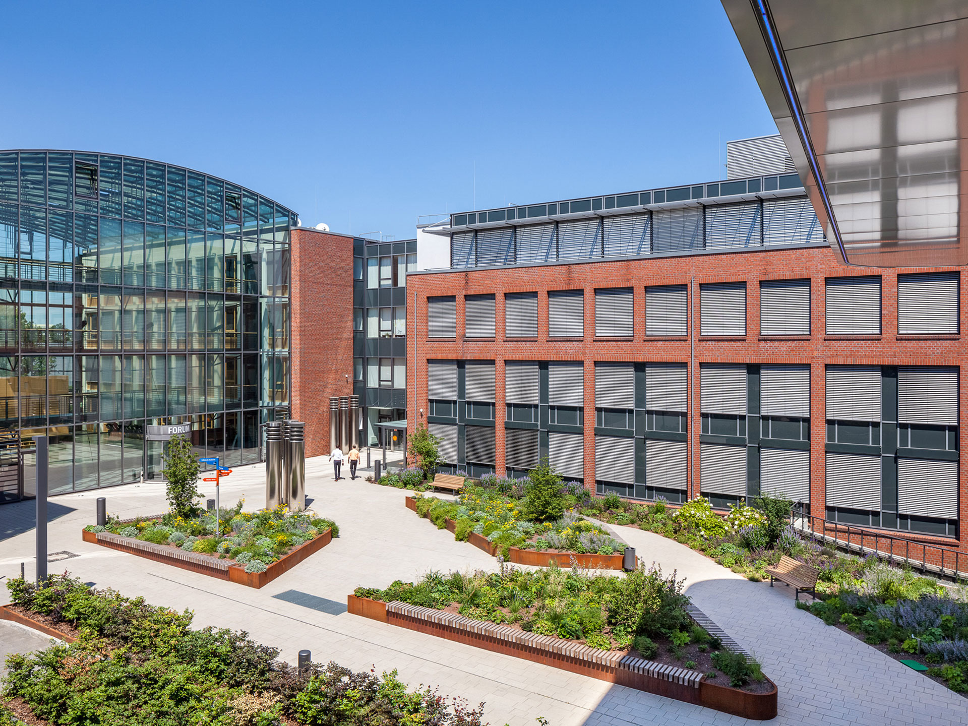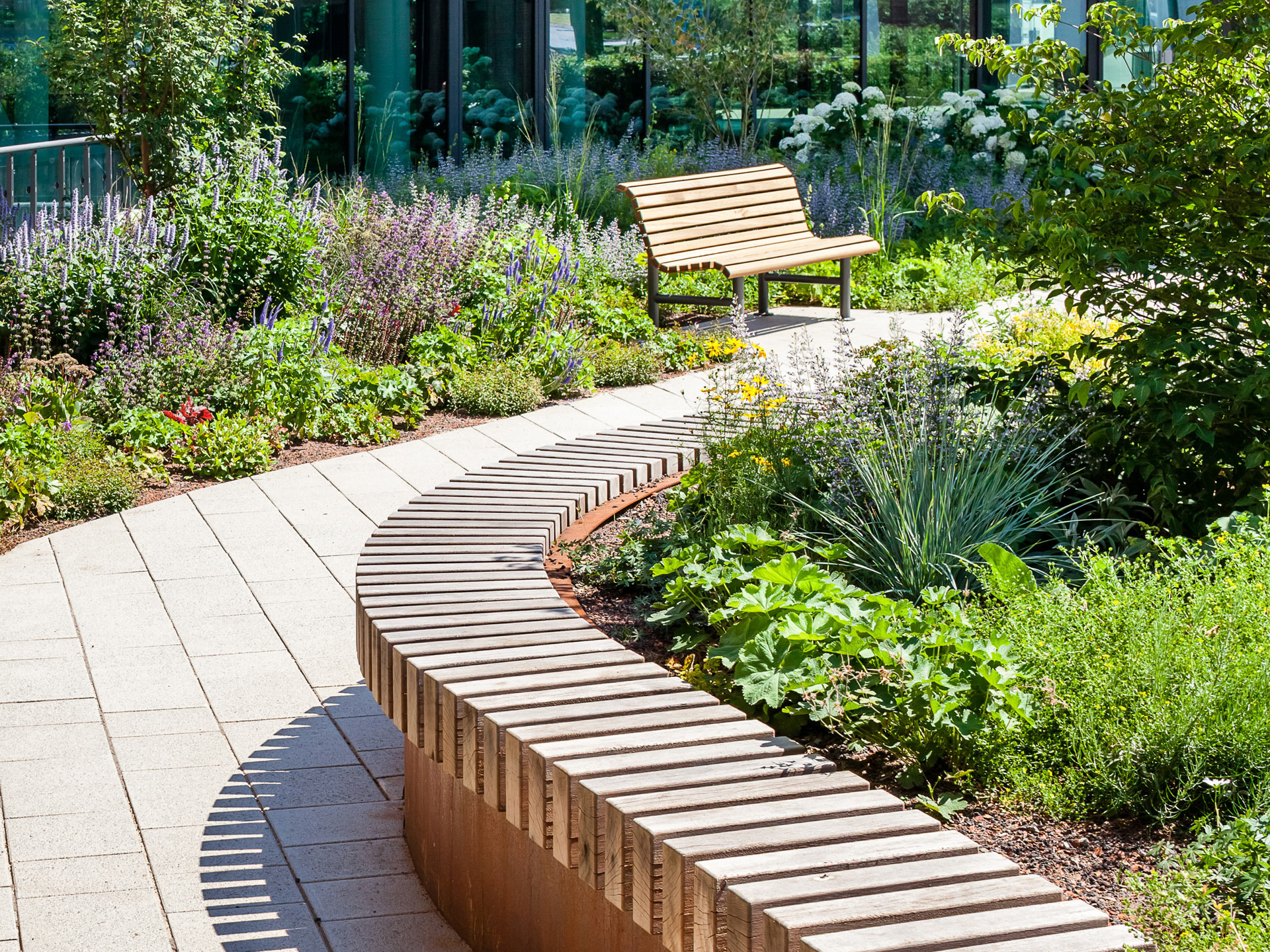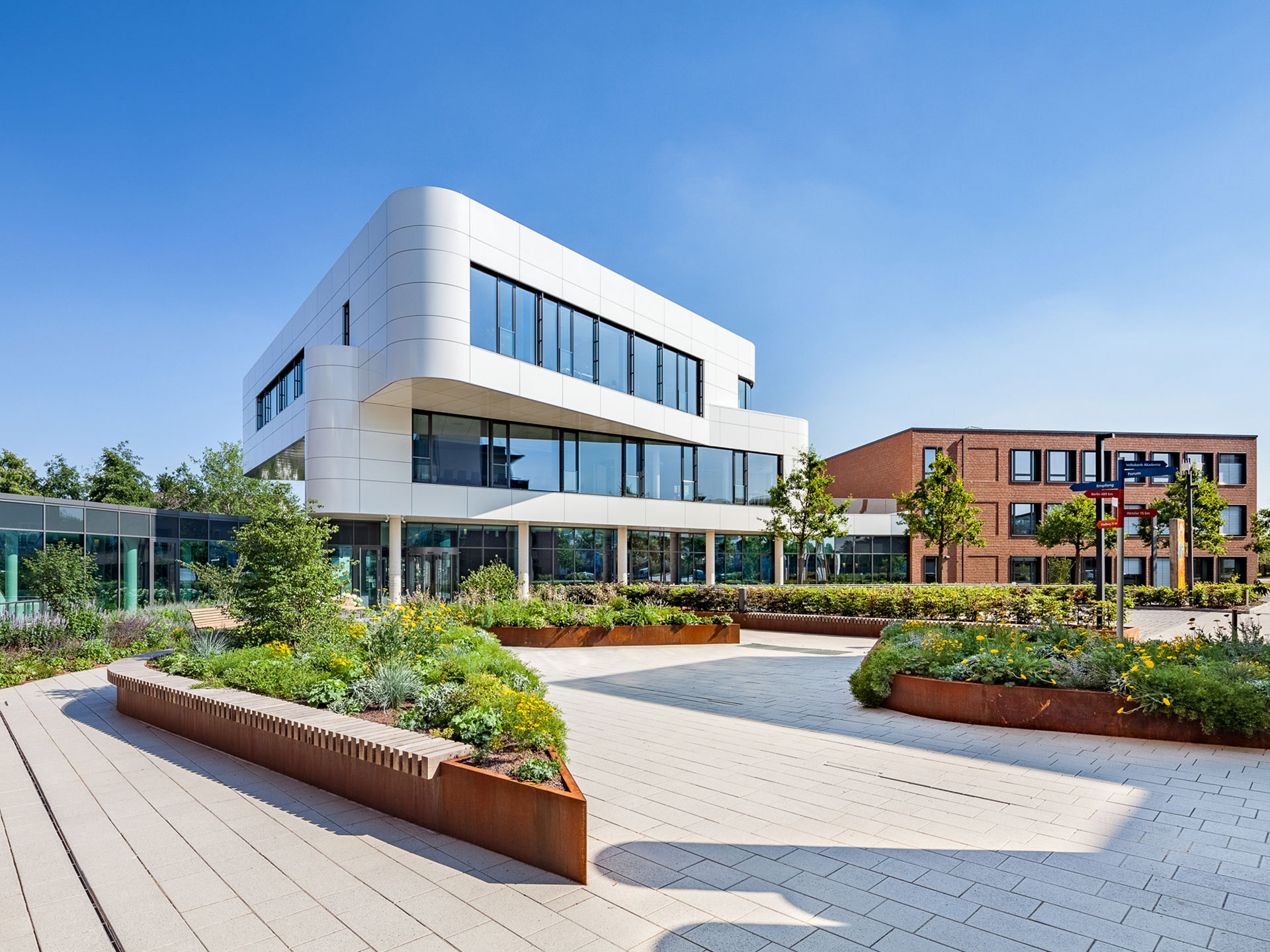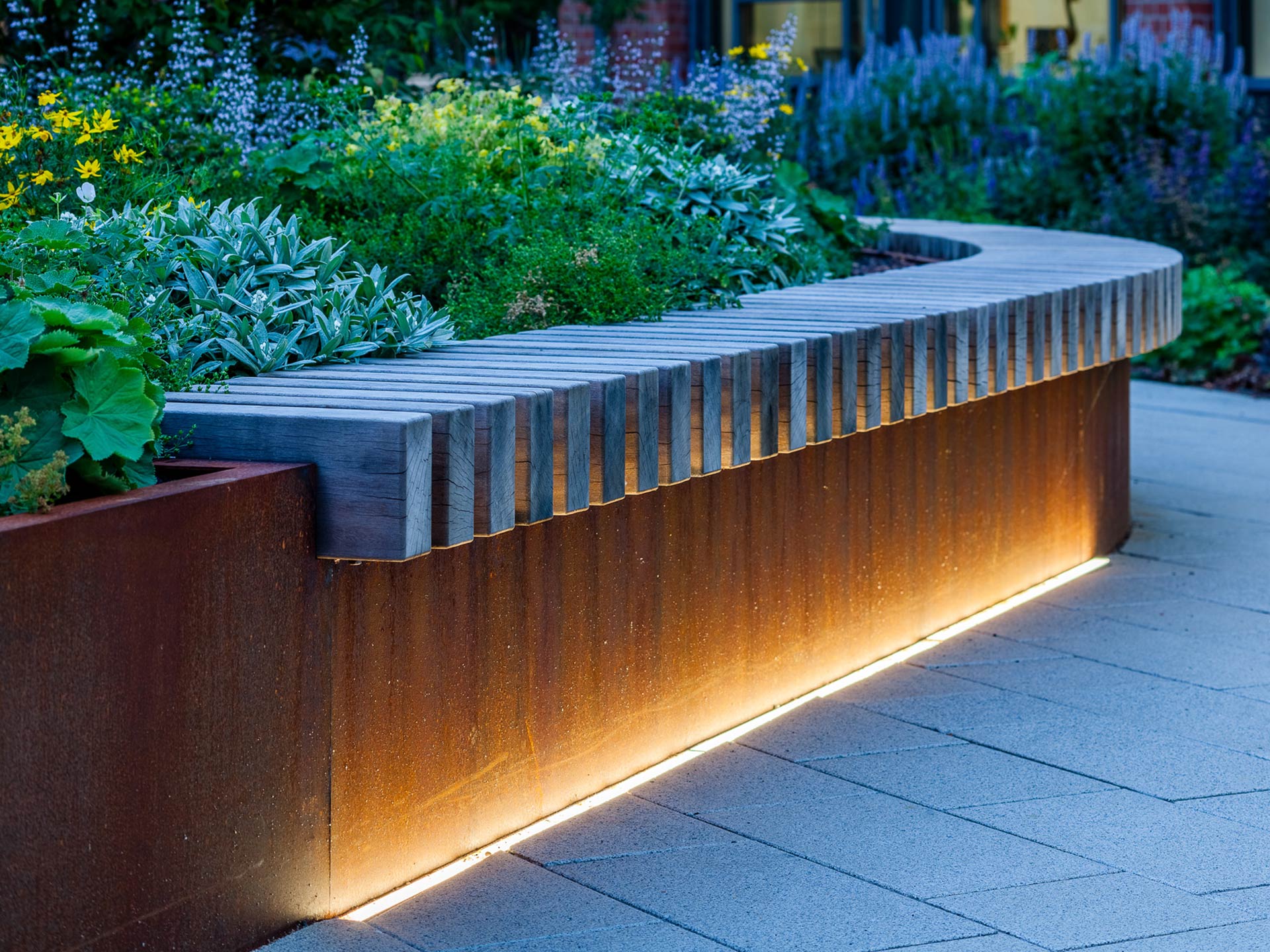 Zusammen mit den jüngsten Erweiterungsbauten konnten die zentral gelegenen Freianlagen im Charakter eines Gartenhofes gestaltet werden. In eine linear strukturierte Belagsfläche sind konträre Elemente als frei geformte Grüninseln aus Corten-Stahl eingelegt. In die Aufkantung der Beete sind Sitzbänke integriert. LED-Lichtbänder erzeugen ein stimmungsvolles Ambiente.