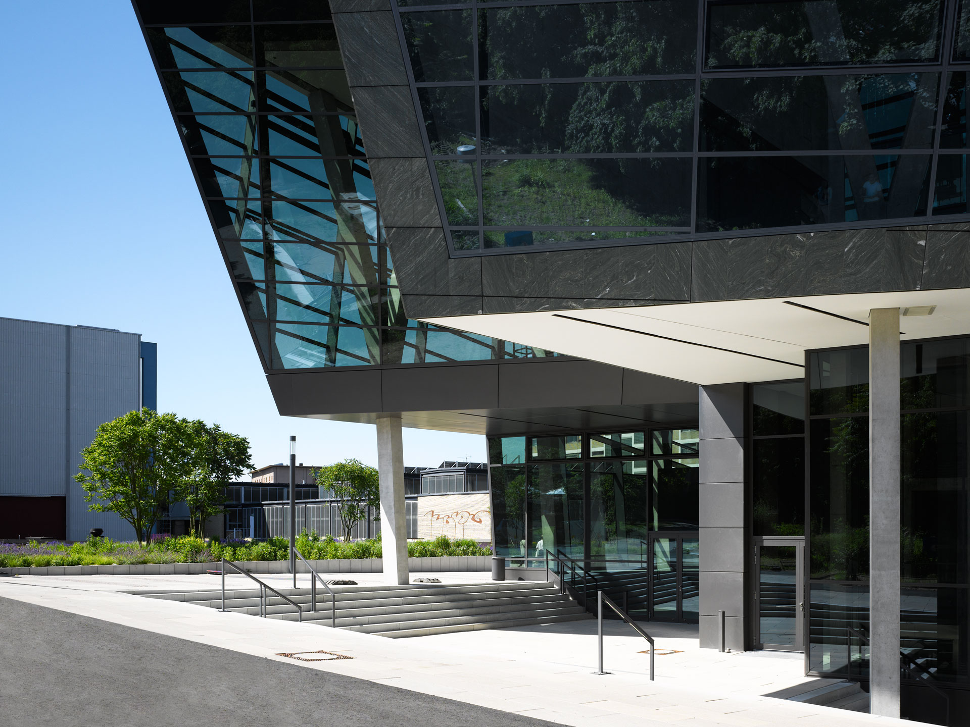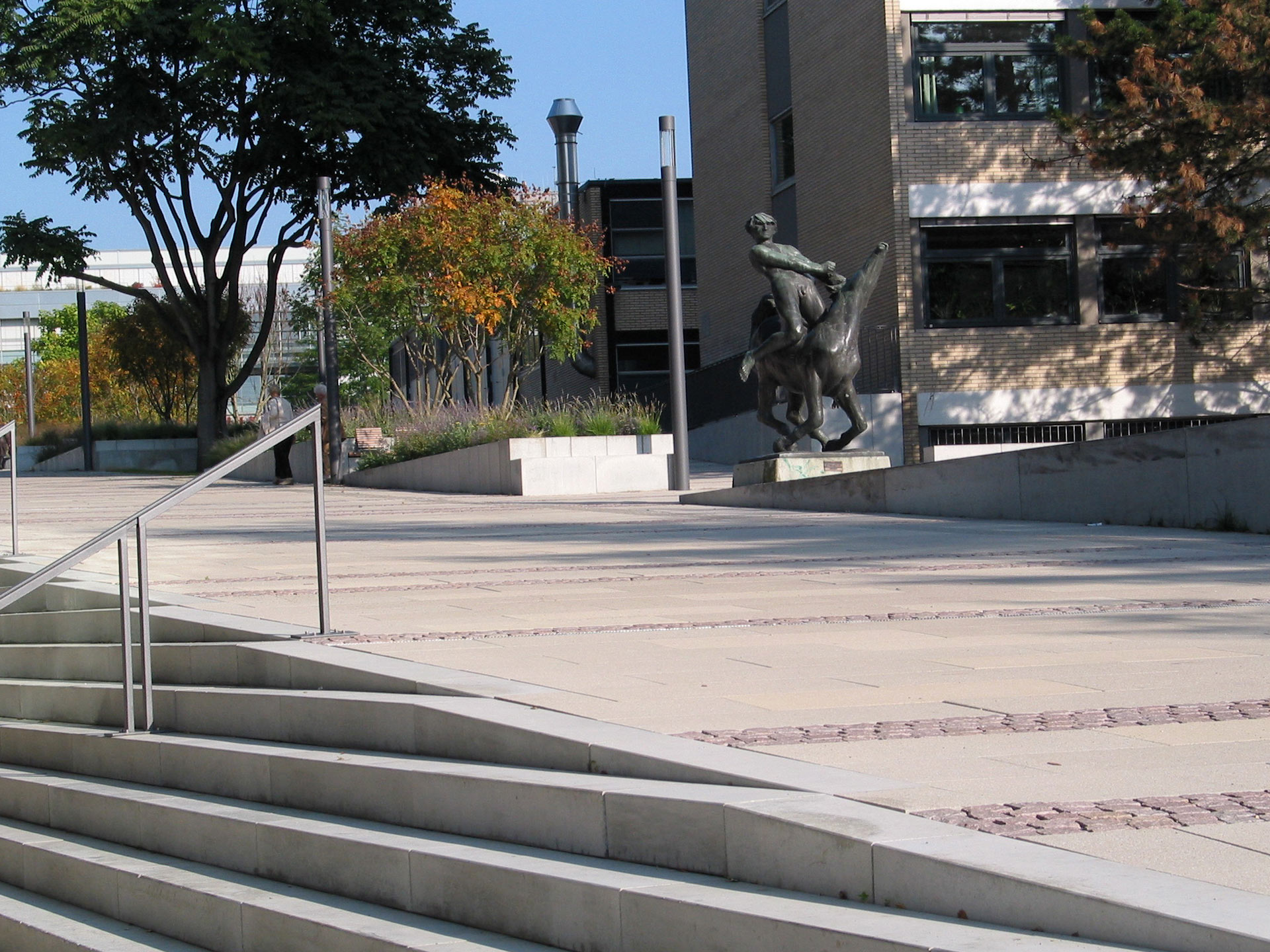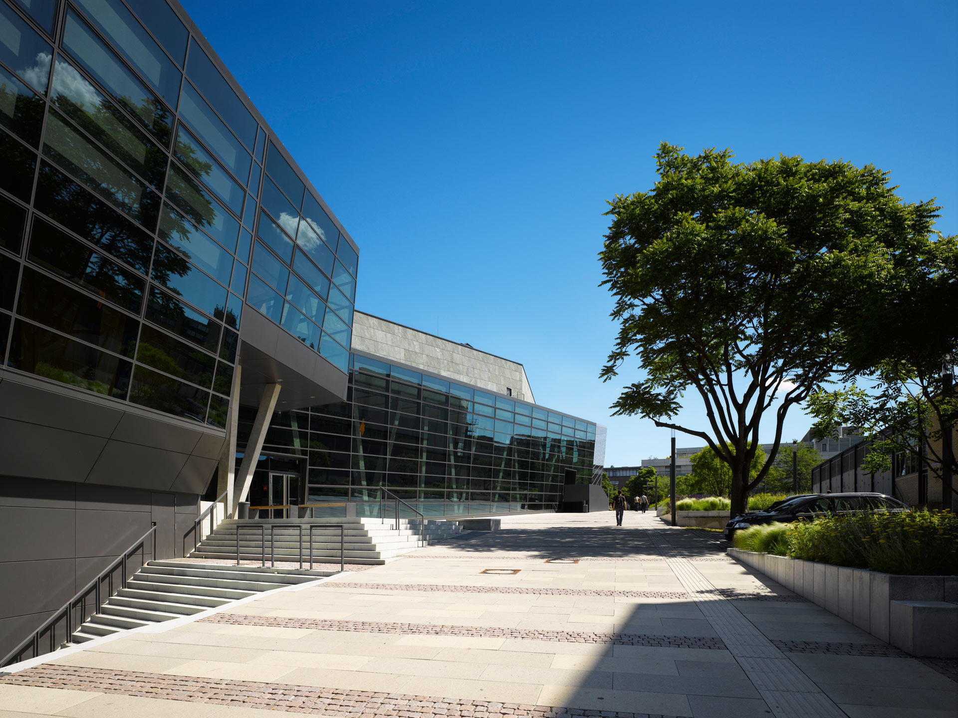 Aus Zwangspunkten der Gebäudearchitektur mit der Topografie entwickeln sich die Freiräume am WKZ über markante Treppenanlagen zu Terrassen, Plätzen und Promenaden. Durch die Geländeabstufungen, kombiniert mit den Auskragungen und Rücksprüngen des Gebäudes, ergeben sich platzartige Aufweitungen, die die erwünschten Voraussetzungen zur Gestaltung eines differenzierten Freiraumgerüstes als Bühne vielfältiger Freiraumnutzungen schaffen.