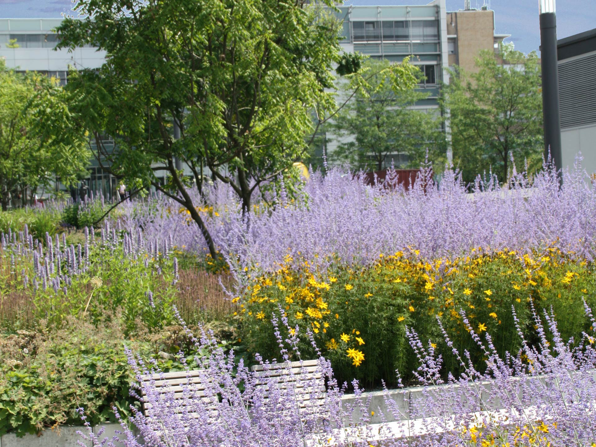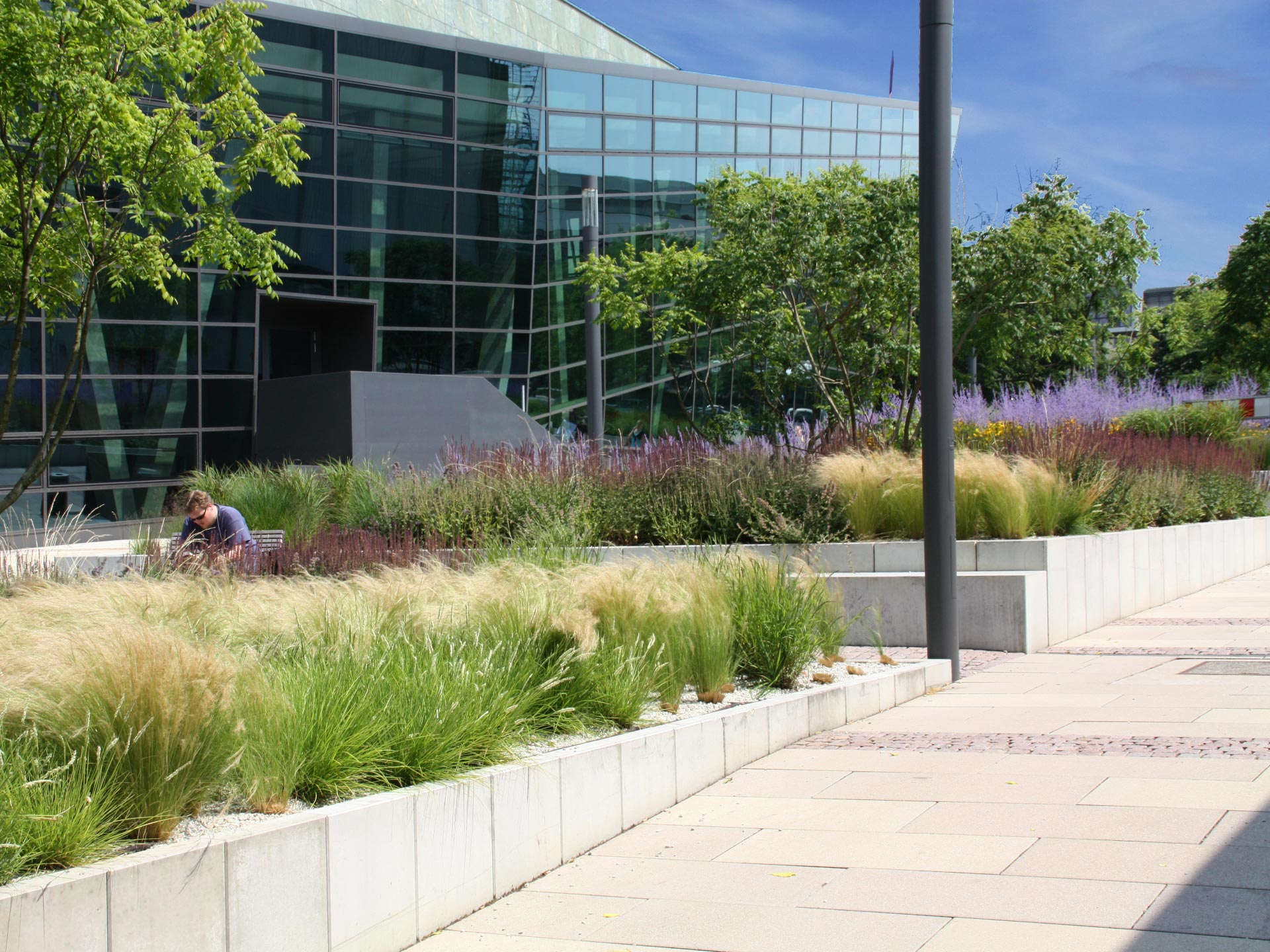 Besonderer Wert wird auf eine moderne und attraktive Pflanzenverwendung gelegt, deren wesentliche Elemente mehrtriebige, schirmförmige Bäume in hainartiger Anordnung sind, kombiniert mit großzügiger Gras- und Prärievegetation.