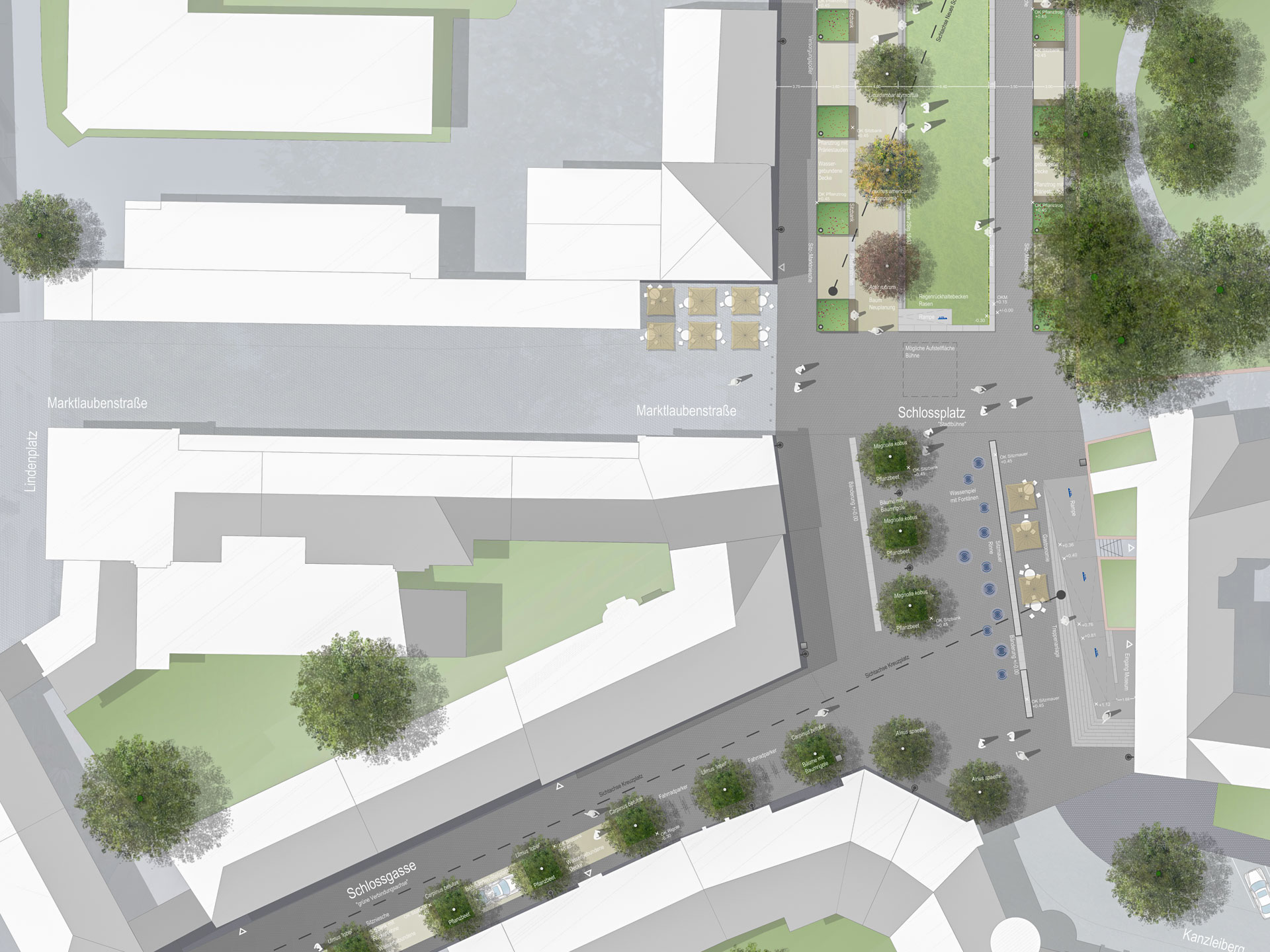 In Anlehnung an die Marktlauben wurden die zwischen den Hochbeeten entstehenden Marktnischen entwickelt, die zu Marktzeiten eine geordnete Aufstellung der Stände ermöglichen und außerhalb der Markttage attraktive Sitzplätze anbieten, die zum Beobachten, Ausruhen, Austauschen, Lernen und Nachdenken einladen. Durch das ca. 30 cm abgesenkte Rasengeviert, die „grüne Agora“, entsteht ein zusätzliches individuelles Sitzangebot. Gleichzeitig kann in dem Senkgarten bei einem Starkregenereignis ausreichend viel Regenwasser schadlos zurückgehalten werden. Für Veranstaltungen ergeben sich mindestens drei mögliche Aufstellflächen für Bühnen, bei denen immer entweder das Alte oder Neue Schloss als Kulisse dienen.