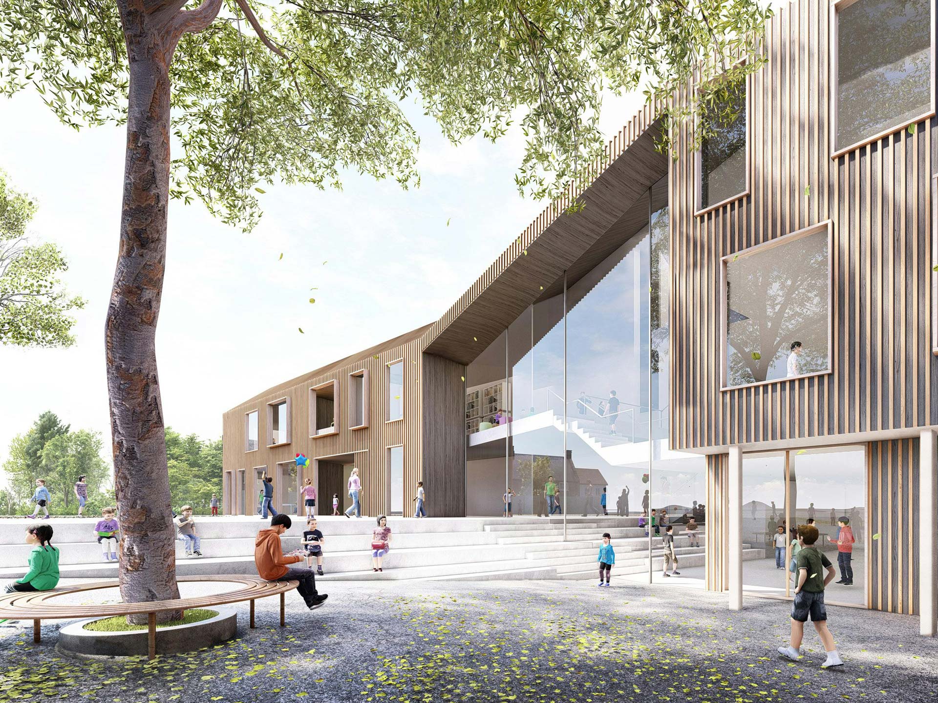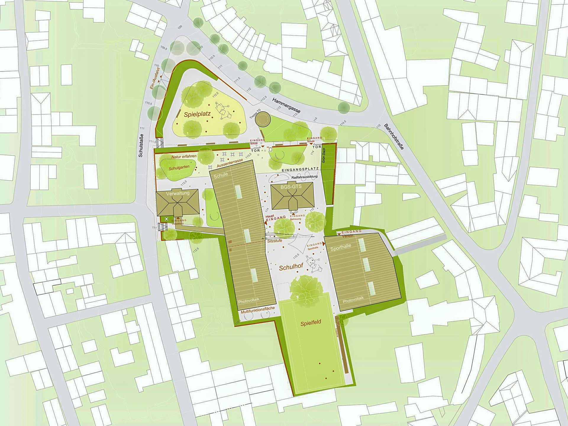 Zusammen mit der seitlichen positionierten Sporthalle an der Stelle der Kelterhalle bildet das neue Schulgebäude einen gut nutzbaren, zusammenhängenden Freiraum für Pause, Sport und Spiel, der von der alten Eiche gegliedert und atmosphärisch geprägt ist. Die Interaktion zwischen Sporthalle und Sportflächen funktioniert sehr gut, jedoch kann der umwegige separate Zugang für die Vereine entlang der Rückseite nicht überzeugen. Das kompakte Schulgebäude weist eine hervorragende innere Organisation der Räume und Cluster-Zuordnung auf. Die halbgeschossig versetzte Erschließung findet sich mit einer Freitreppe verbindend im Freiraum wieder. Über das offene Treppenhaus verbinden sich die Halbgeschosse fließend. Mensa, Mehrzweckraum und Foyer sind flexibel kombinierbar und zum halböffentlichen Raum transparent zugeordnet. Wenig überzeugen kann jedoch der Giebel des Gebäudes in seiner Ausgestaltung und funktionalen Belegung zum Platzraum. Willkürlich gesetzt erscheint die Begrenzungsmauer zum Platz. Dieser Effekt wird noch verstärkt durch eine zusätzliche Stufung im Gelände. Kontrovers diskutiert wird die Ausformung der Tiefgarage mit einem prägnant vorgeschobenen Plateau, das im Stadtraum zwei getrennte Nutzungsebenen schafft. Die kompakte Bauform und vorgeschlagene Materialität lassen für Schulgebäude und Sporthalle eine wirtschaftliche Erstellung und ebensolchen Betrieb erwarten. Dem gegenüber wird die vorgelagerte Tiefgarage die Wirtschaftlichkeit beeinträchtigen. Insgesamt liefert der Entwurf einen eigenständigen, gut funktionierenden Beitrag mit hoher Qualität und Differenziertheit.
