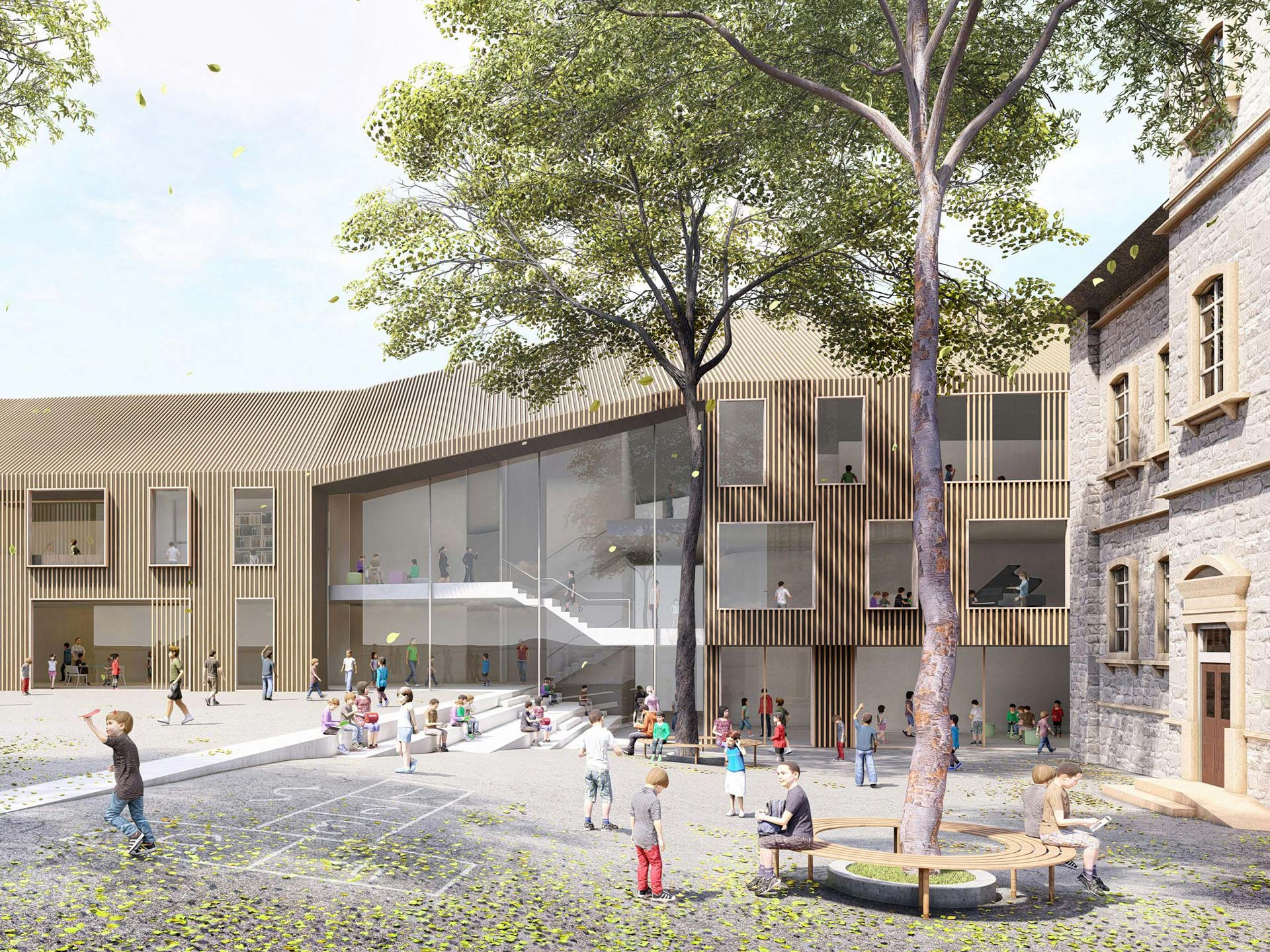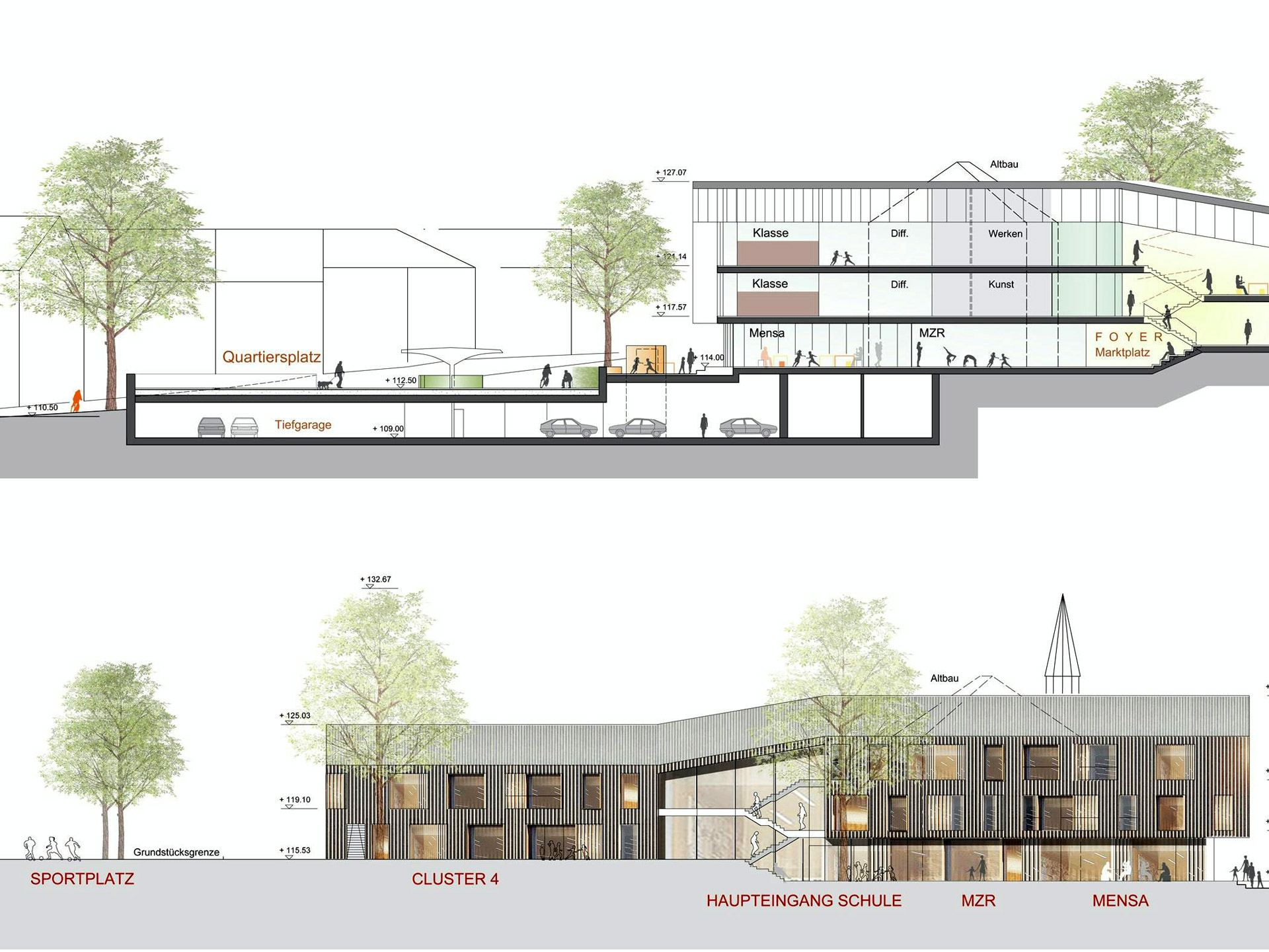 Das Schulgebäude schiebt sich selbstbewusst zwischen die historischen Schulgebäude und in den Stadtraum hinein. So stellt es einerseits das denkmalgeschützte Gebäude von allen Seiten frei in den Raum und verleiht ihm eine besondere Position und „neue Würde“ im Stadtraum. Andererseits führt dies zur Separierung des westlichen Gebäudes mit seiner so auch abgegrenzten Einbindung in den schulischen Ablauf.