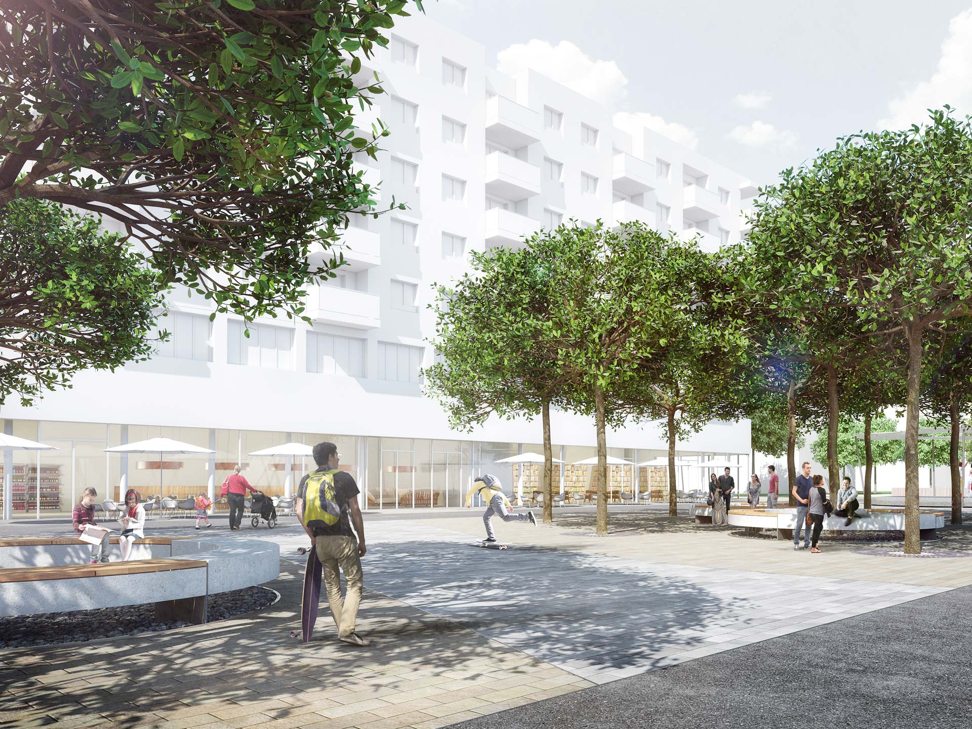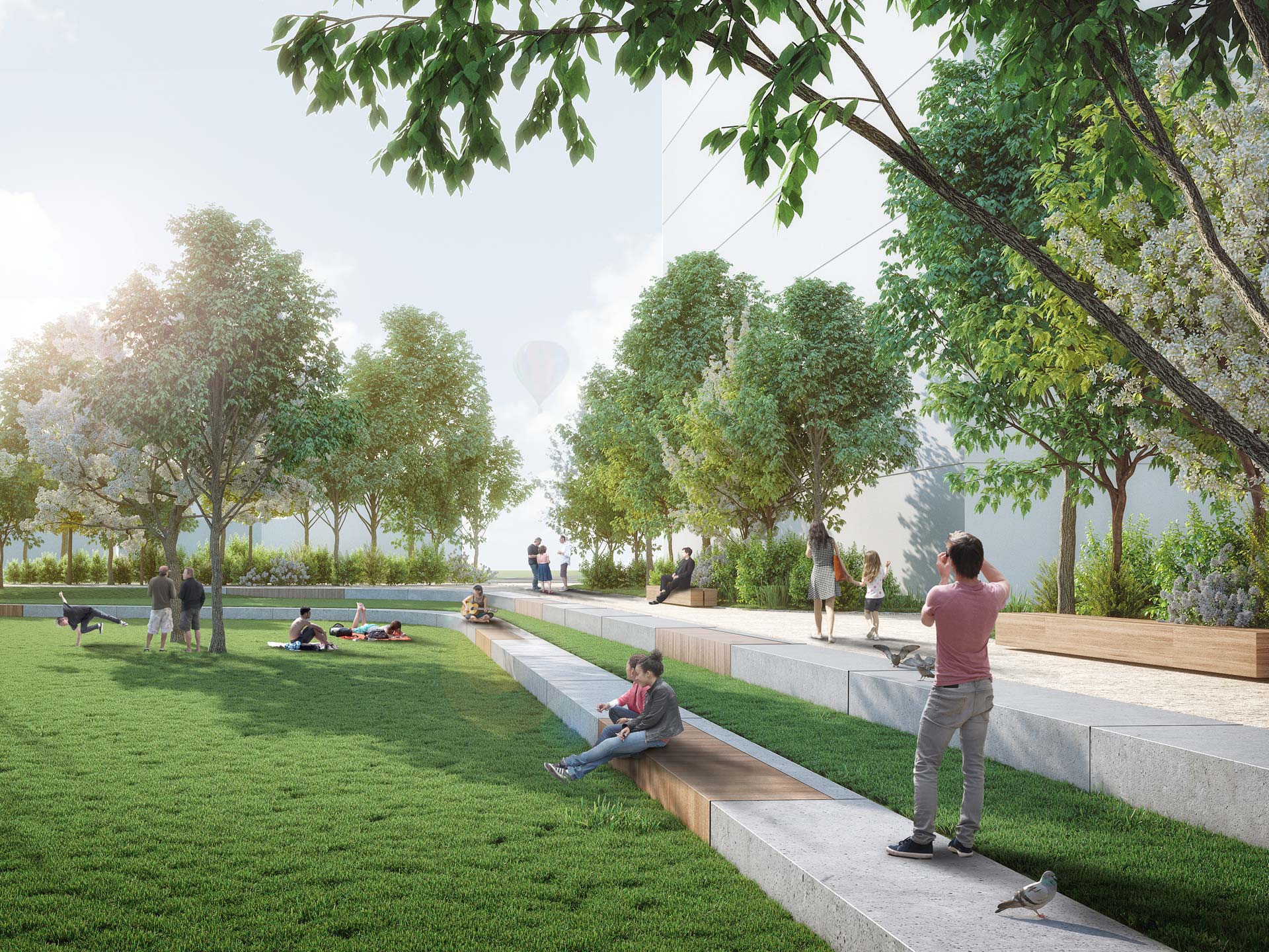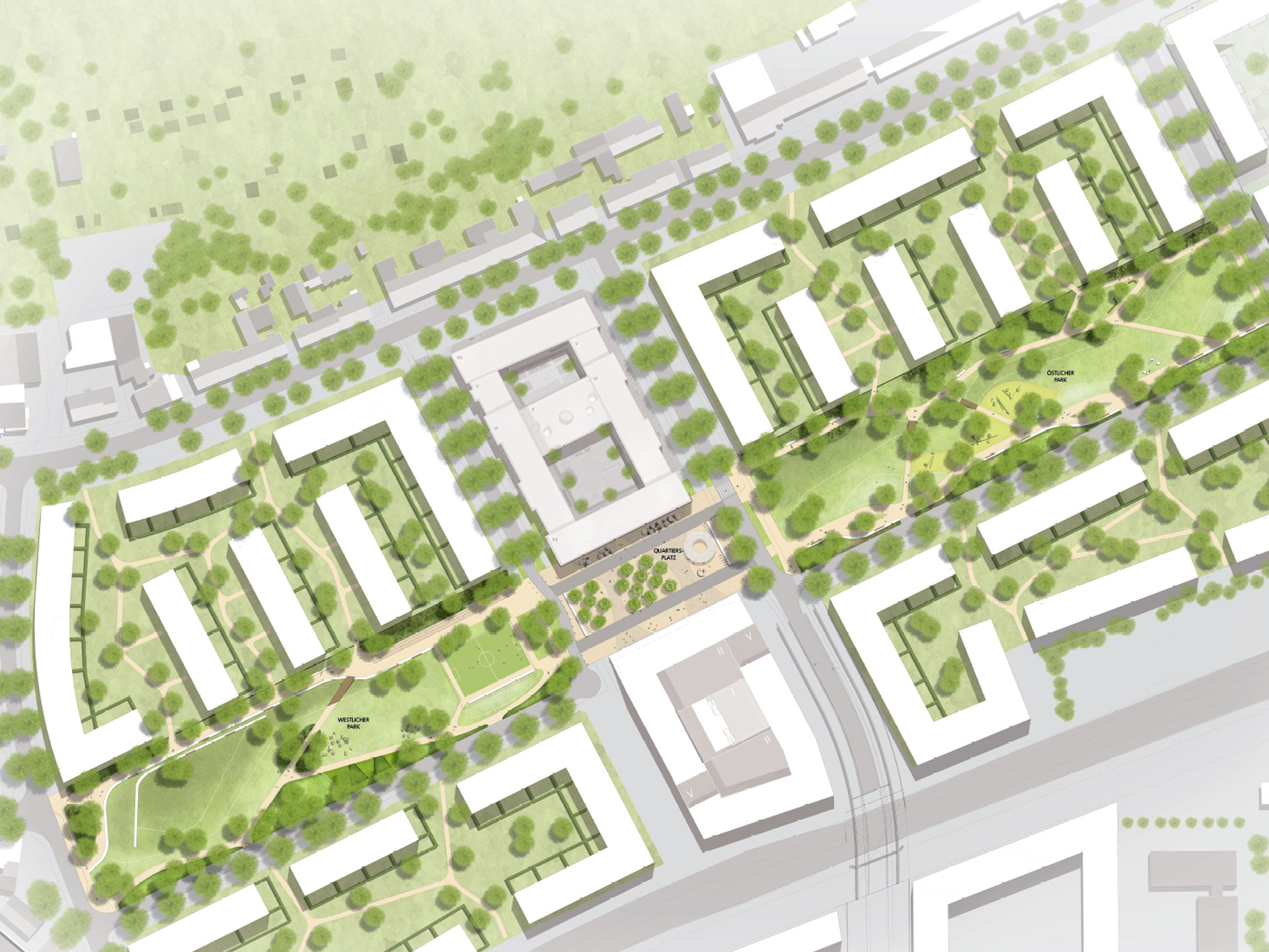 Aus dem städtebaulichen Konzept für das Quartier leitet sich die Grundausrichtung der Grünanlage als Quartierspark ab: Die rahmende Bebauung schützt den grünen Binnenraum gegen Verkehr, Emissionen und städtische Geschäftigkeit. Im Quartierspark bewegen sich die Anwohner zu Fuß und per Rad, hier ist der nachbarschaftliche Begegnungsort, Raum für Erholung, Spiel und Sport.